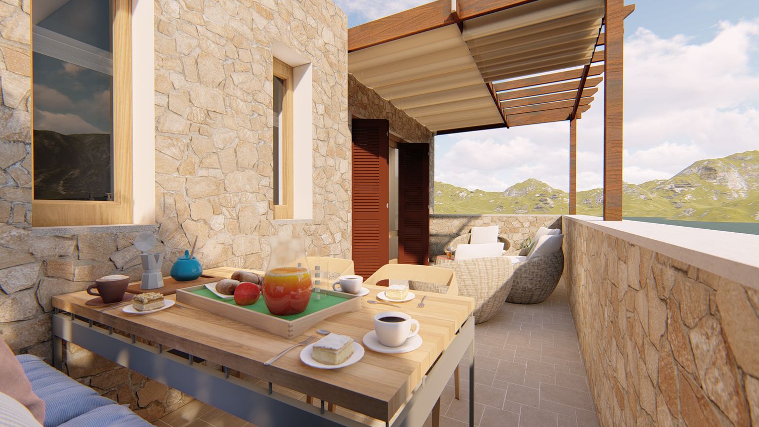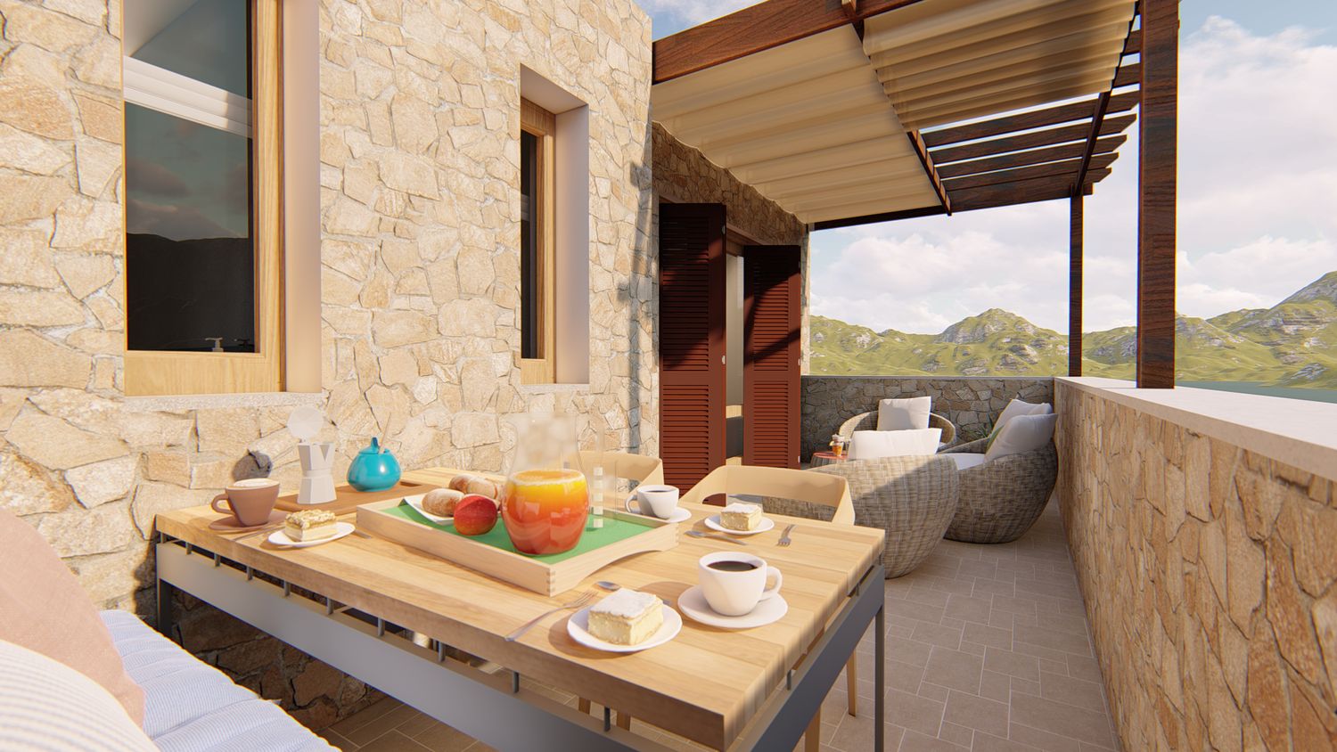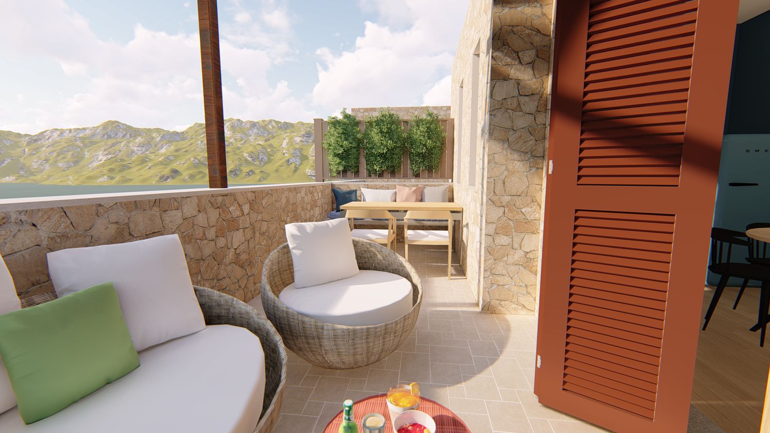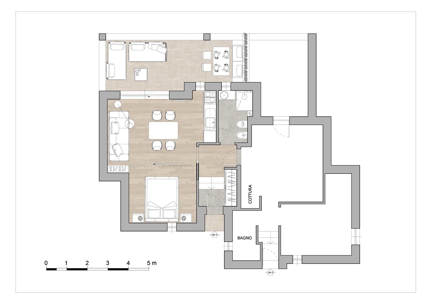 7. Arredo del terrazzo: anche quest'area viene arredata in modo da diventare una funzionale e comoda estensione della vita e della convivialità. La panca esistente diventa la base per creare una piccola zona pranzo outdoor, mentre sotto il pergolo/portico viene posizionata una pratica zona divani.