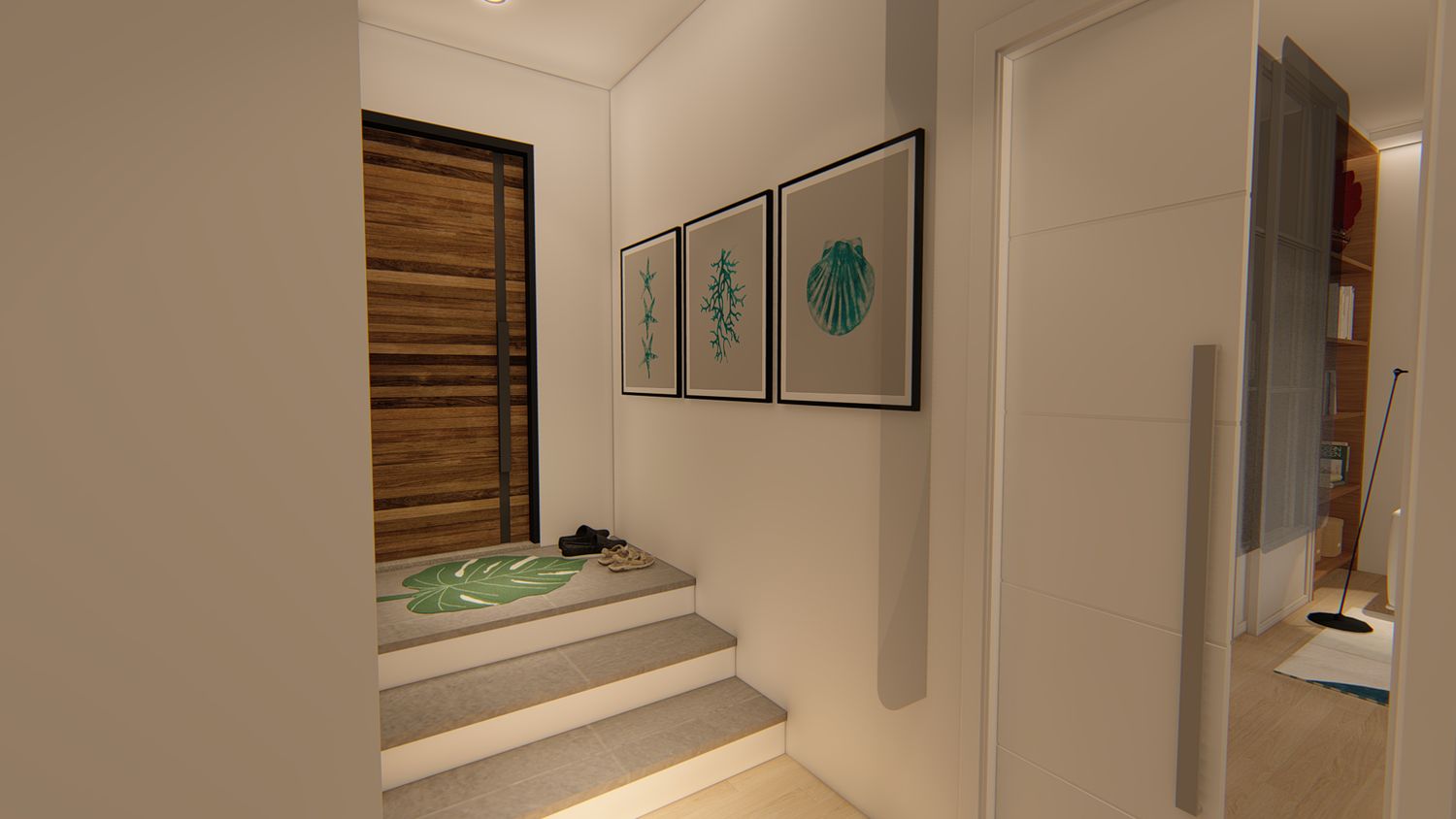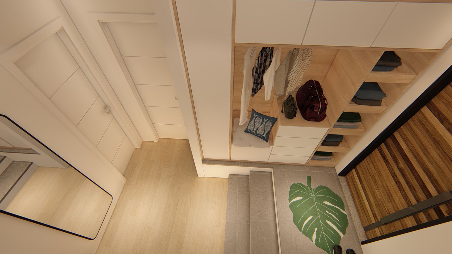 1. Modifica dell'ingresso/disimpegno, arredato con un capiente guardaroba, posizionato sfruttando il dislivello fra ingresso e interno della casa: in questo modo, si crea un'area separata, dedicata ad abiti, giacche, scarpe ecc. Accanto all'area guardaroba, verrà aperta la porta di comunicazione con la casa vicina: dall'altro lato, abbiamo previsto una modifica dell'angolo cottura in modo che la porta si apra senza dare fastidio; quest'area, inoltre, serve per disimpegnare il bagno in modo comodo e pratico.