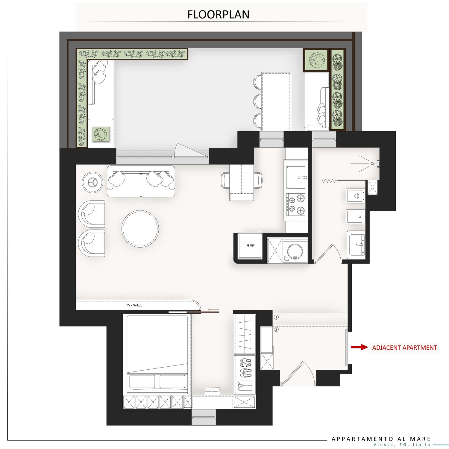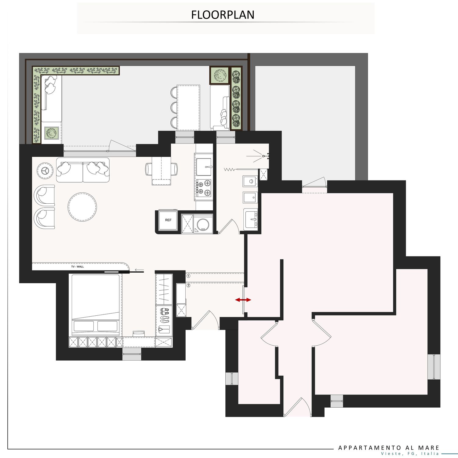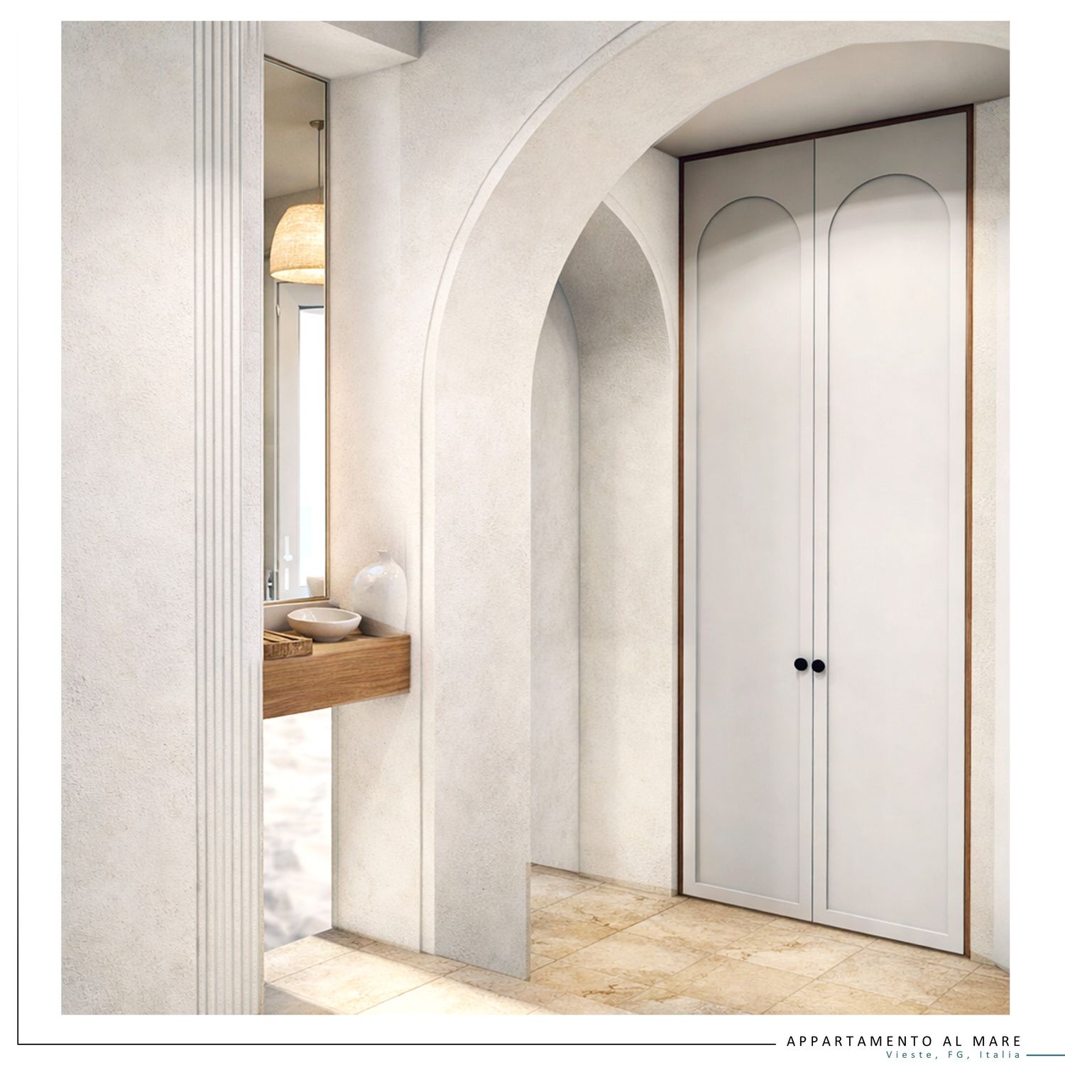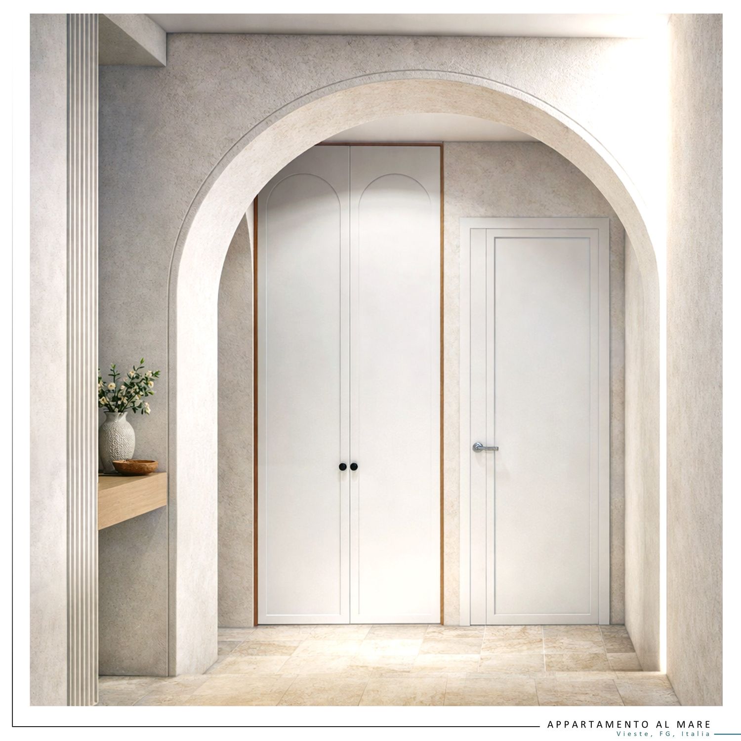 Nel processo progettuale si è scelto di mantenere la completa indipendenza dell’unità abitativa, prevedendo al contempo la possibilità di un futuro collegamento con l’unità adiacente tramite una porta interna di comunicazione. Tale soluzione è stata studiata con attenzione affinché questa potenzialità non influisca in alcun modo, nella configurazione attuale, sulla qualità degli spazi, sulla chiarezza distributiva del progetto né sull’autonomia funzionale dell’abitazione.