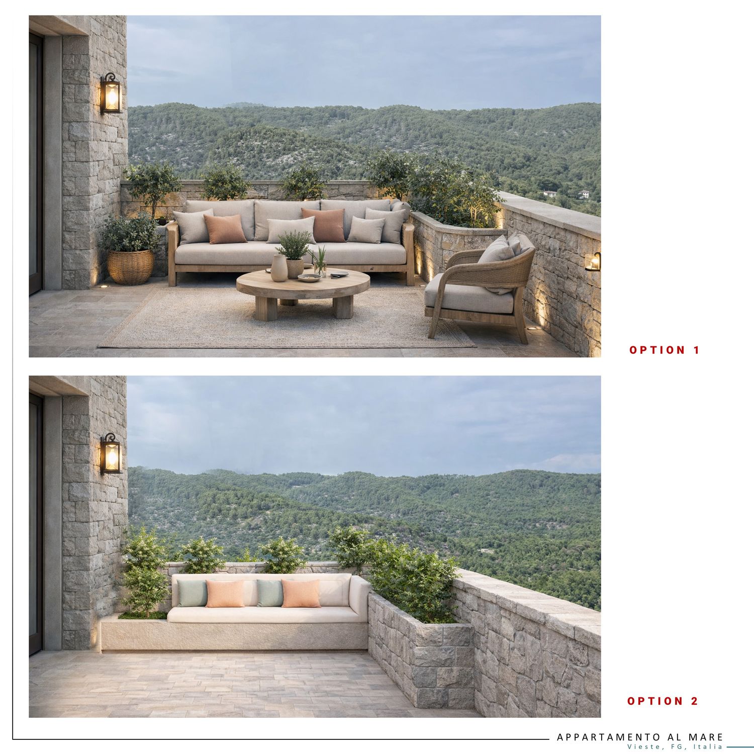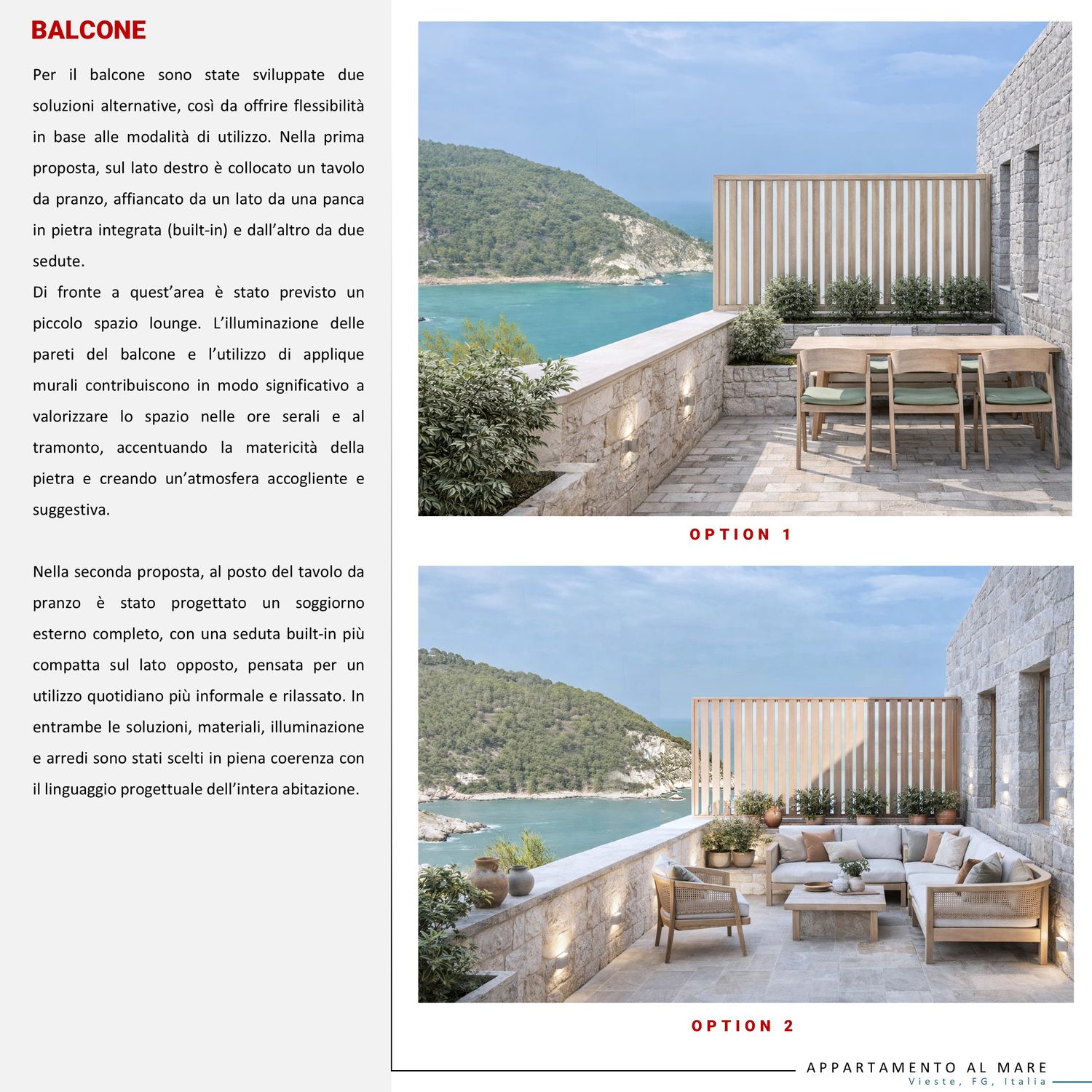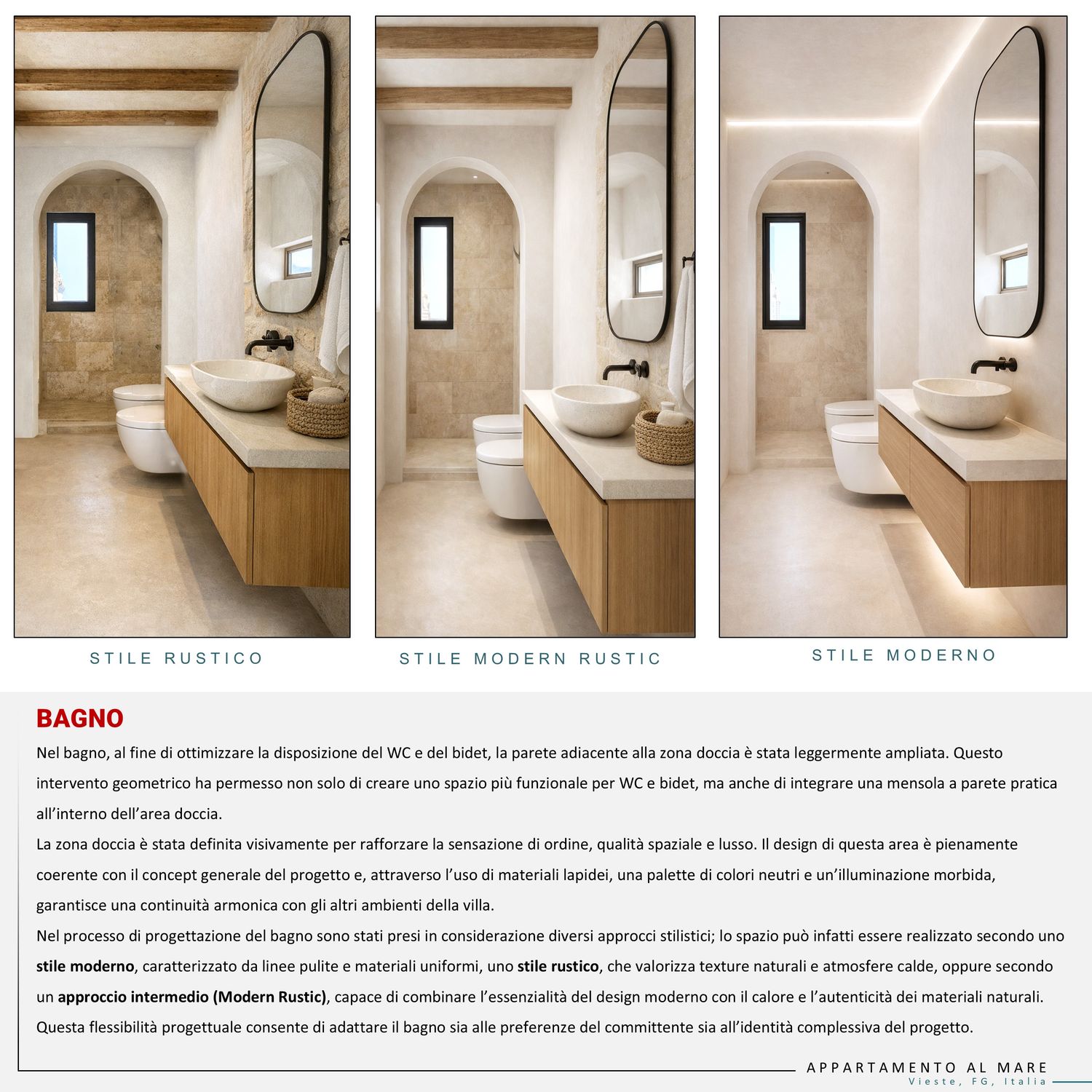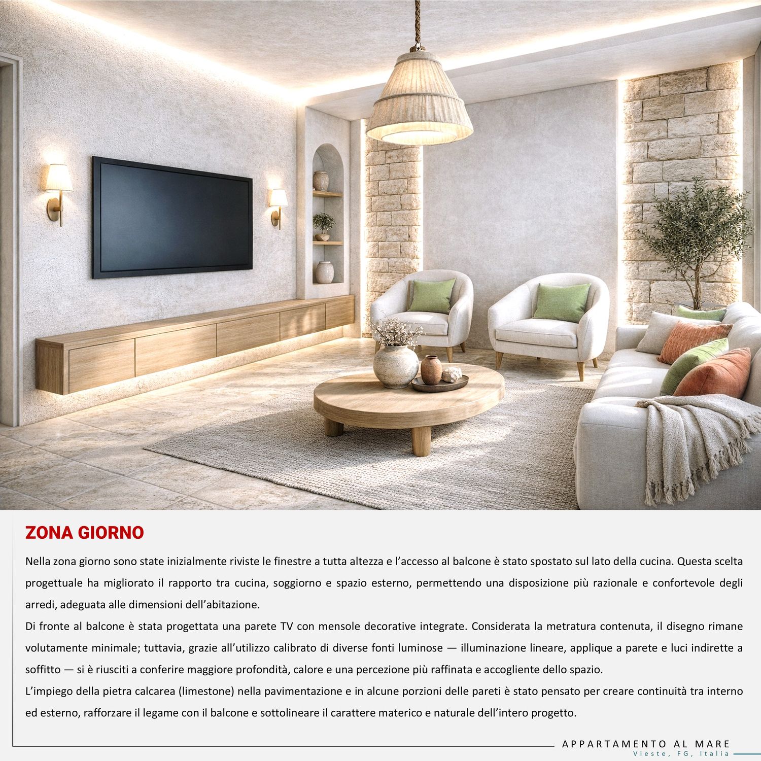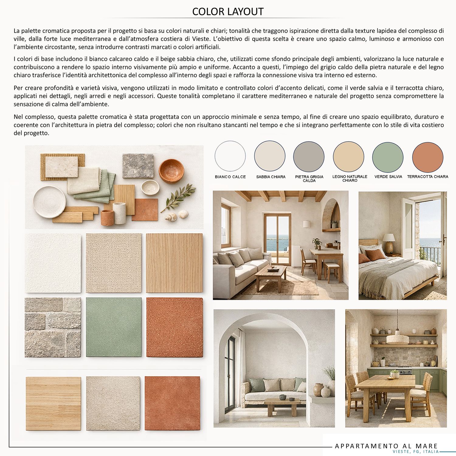 La proposta progettuale è stata sviluppata in piena coerenza con le caratteristiche architettoniche, i materiali e la palette cromatica del complesso di ville adiacenti, tutte realizzate in pietra e dotate di una forte identità architettonica. In questo contesto, l’utilizzo di materiali naturali, una gamma cromatica chiara ed equilibrata e un sistema di illuminazione controllato e mirato sono stati scelti con l’intento di creare un ambiente accogliente, caldo e in armonia con il contesto e il clima costiero della zona.