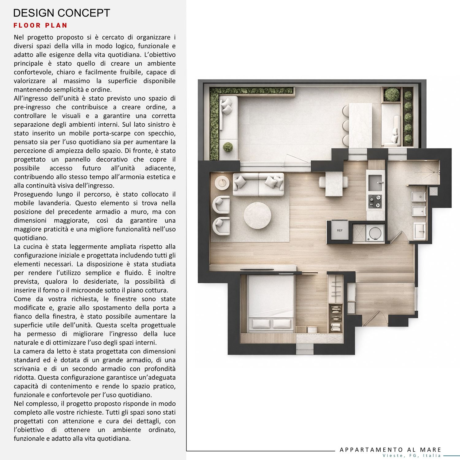 Le soluzioni e le idee progettuali relative a ciascuna area dell’abitazione sono state presentate separatamente all’interno di tavole dedicate a ogni singolo spazio, così da consentire una lettura chiara, ordinata e approfondita della proposta. Per questo motivo, in questa sezione si è scelto di evitare descrizioni ripetitive o ridondanti.