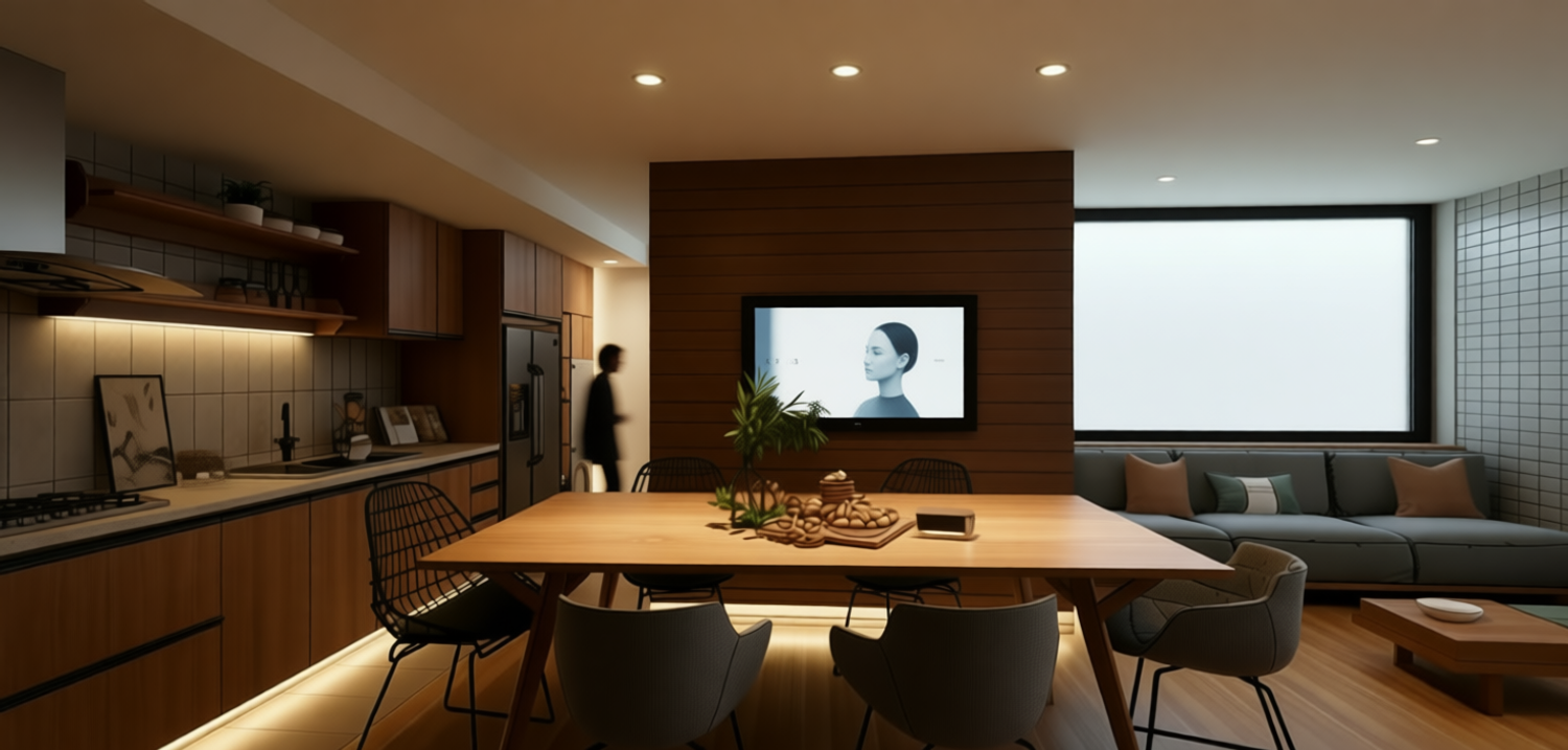 This is a medium-sized urban apartment designed for calm, modern living. It features an open-plan layout with a warm material palette of natural wood, textured fabrics, and matte metals, complemented by layered ambient and task lighting. A frosted glass panel above the sofa softly reveals a figure passing through the hallway—adding quiet humanity to the space. Integrated smart elements, like a minimalist display screen and subtle LED lighting, enhance functionality without visual clutter. The result is a grounded, inviting home that balances simplicity, realism, and thoughtful detail.