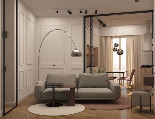 • Glass Partition: Between kitchen and living room to separate the areas while maintaining natural light.