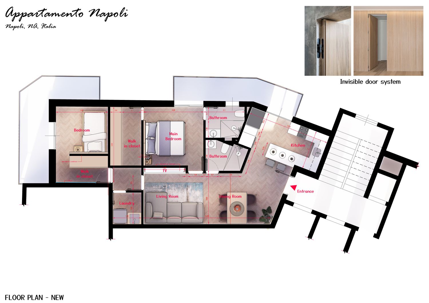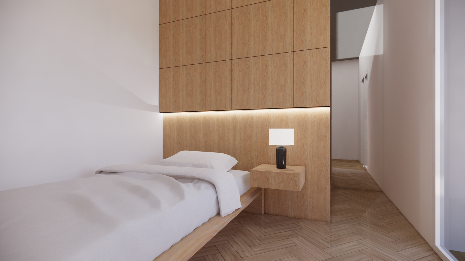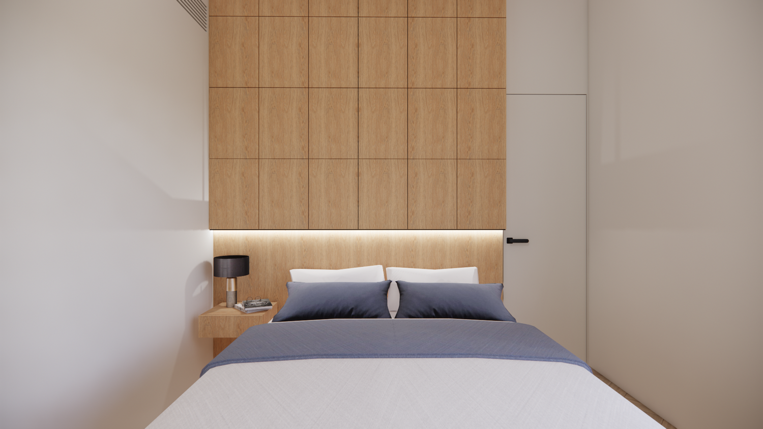 The bedroom and bathroom doors, designed with a concealed system and paneled finish, are integrated into the wall planes, enhancing privacy while reinforcing a clean and sophisticated spatial reading.