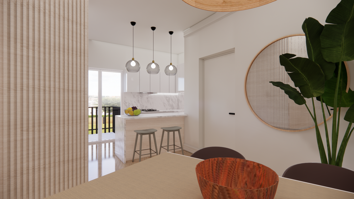 Natural lighting was prioritized by channeling light from the kitchen into the living area through the strategic placement of a mirror in the dining space.