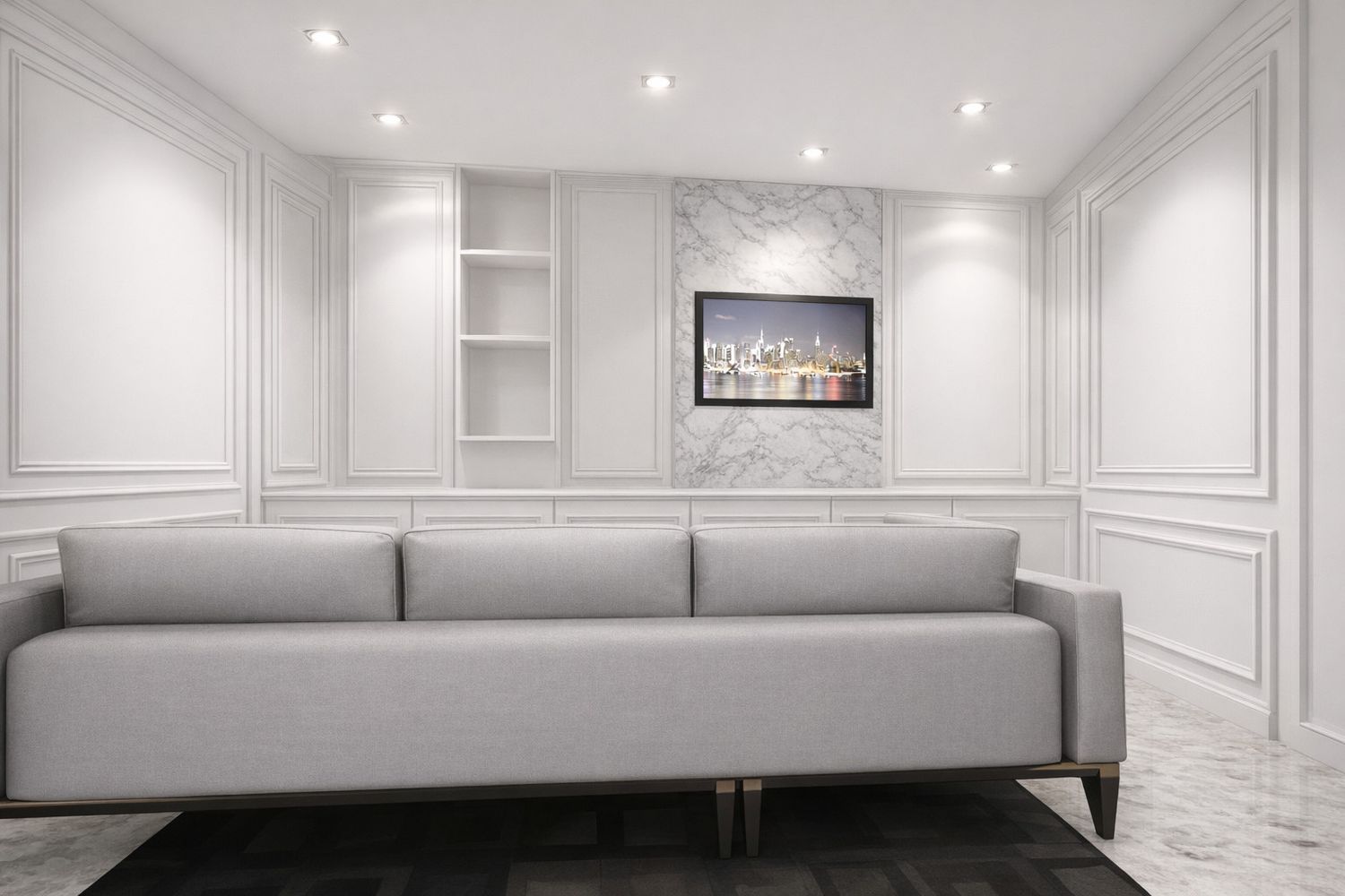 Per quanto riguarda le finiture, ho inserito una boiserie bianca su tutto la zona giorno e la cucina, nel la parete attrezza della vi è una parte rivestita in lastre di marmo, la pavimentazione è in gres effetto marmo. Nella zona notte si ripete la boiserie e la pavimentazione in parquet.