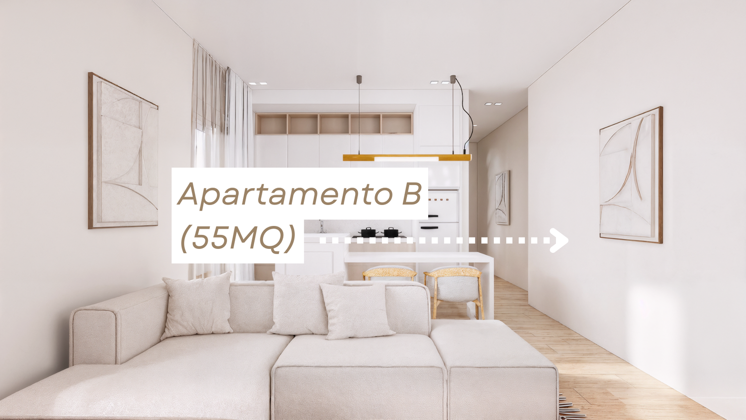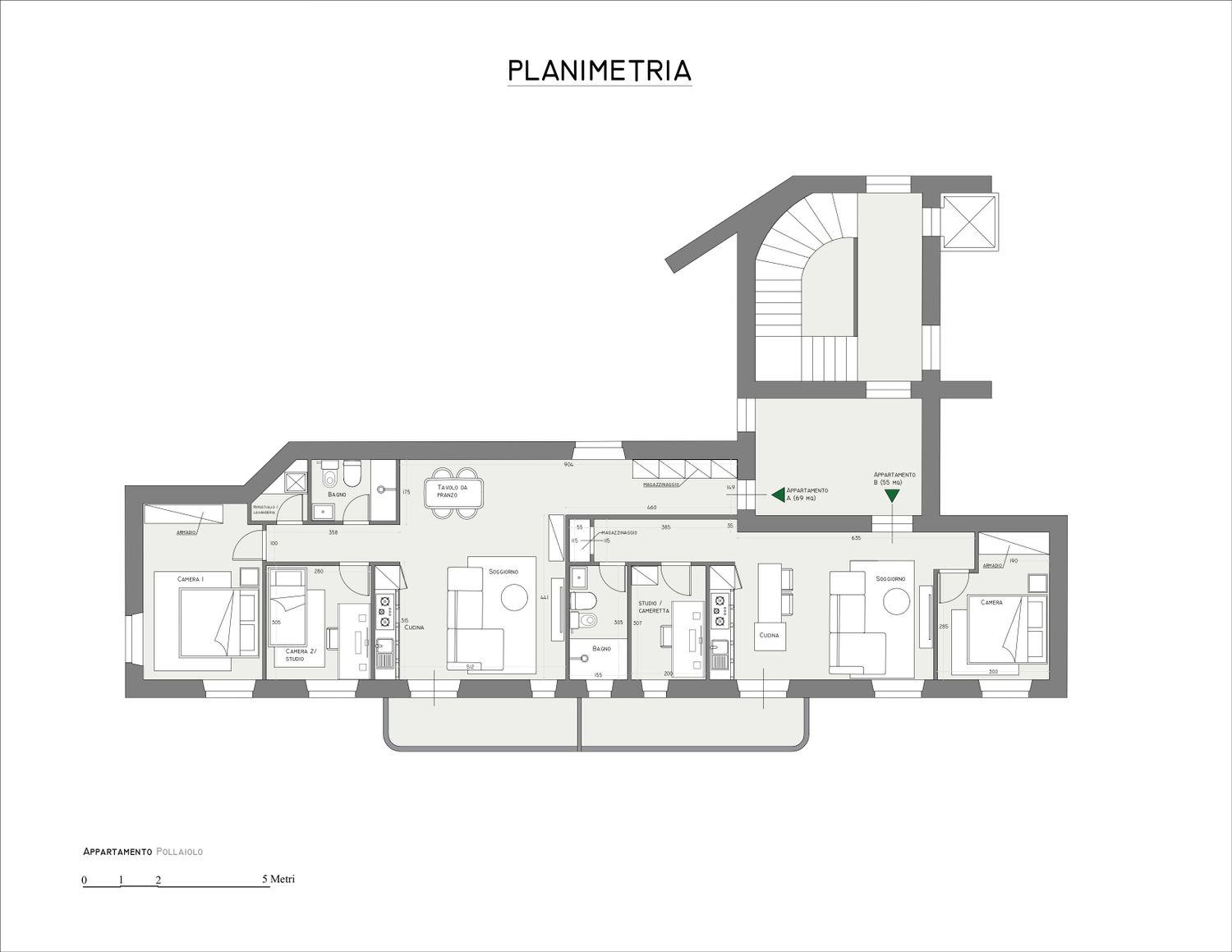Appartamento B: è composto da soggiorno, sala da pranzo, cucina, bagno, lavanderia, camera da letto, studio e ripostiglio.