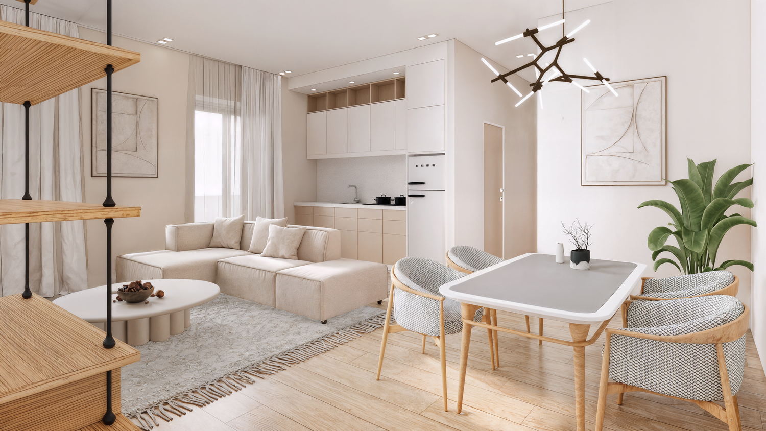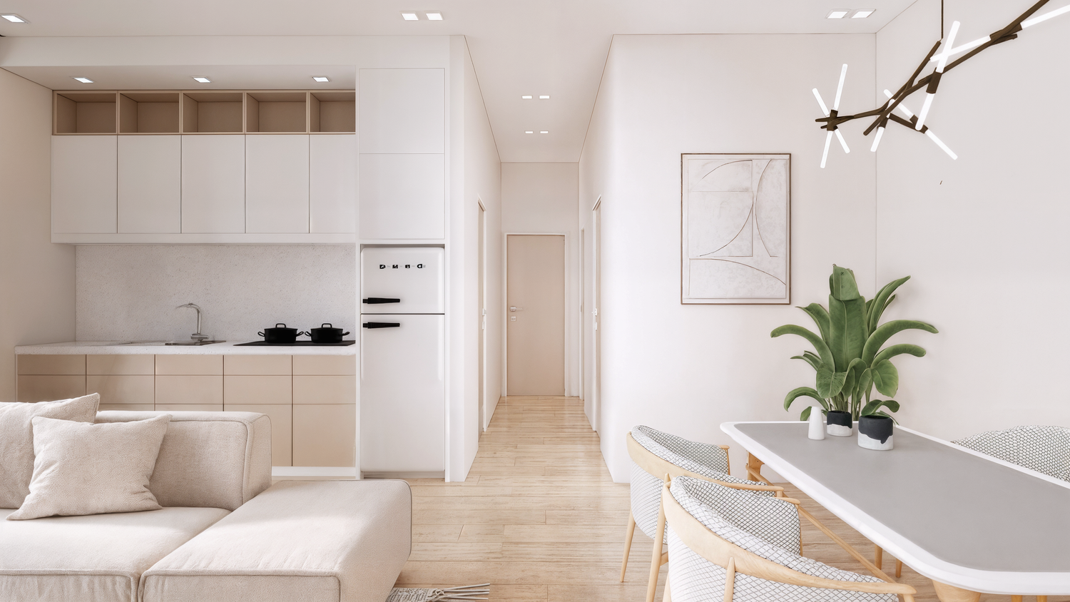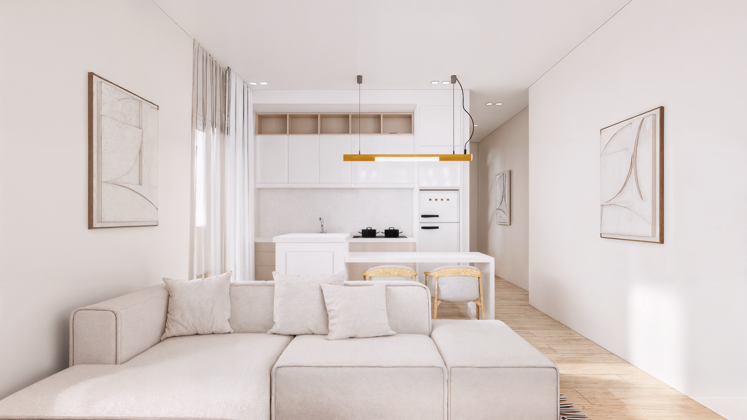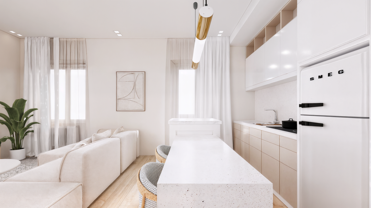 Il design è moderno, dominato dal bianco e dal crema, con tocchi di legno sui pavimenti e su alcuni mobili.