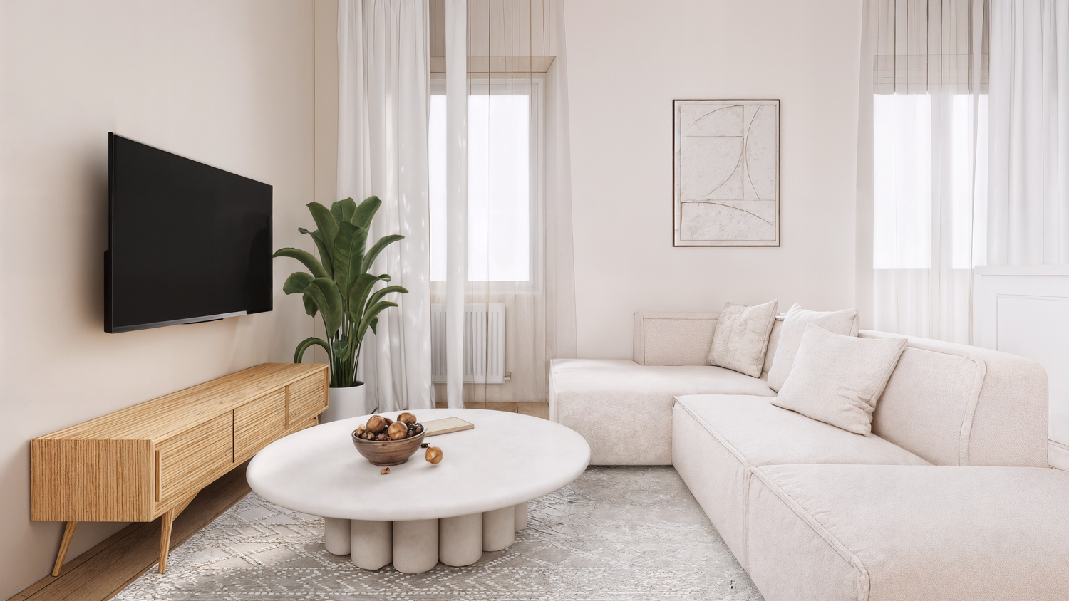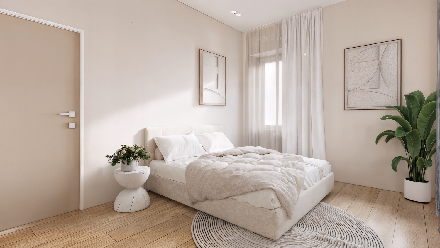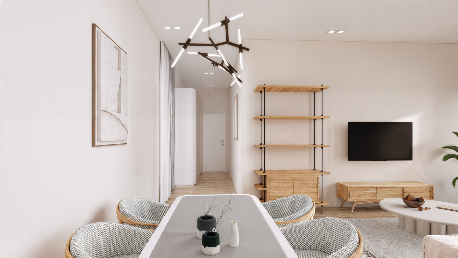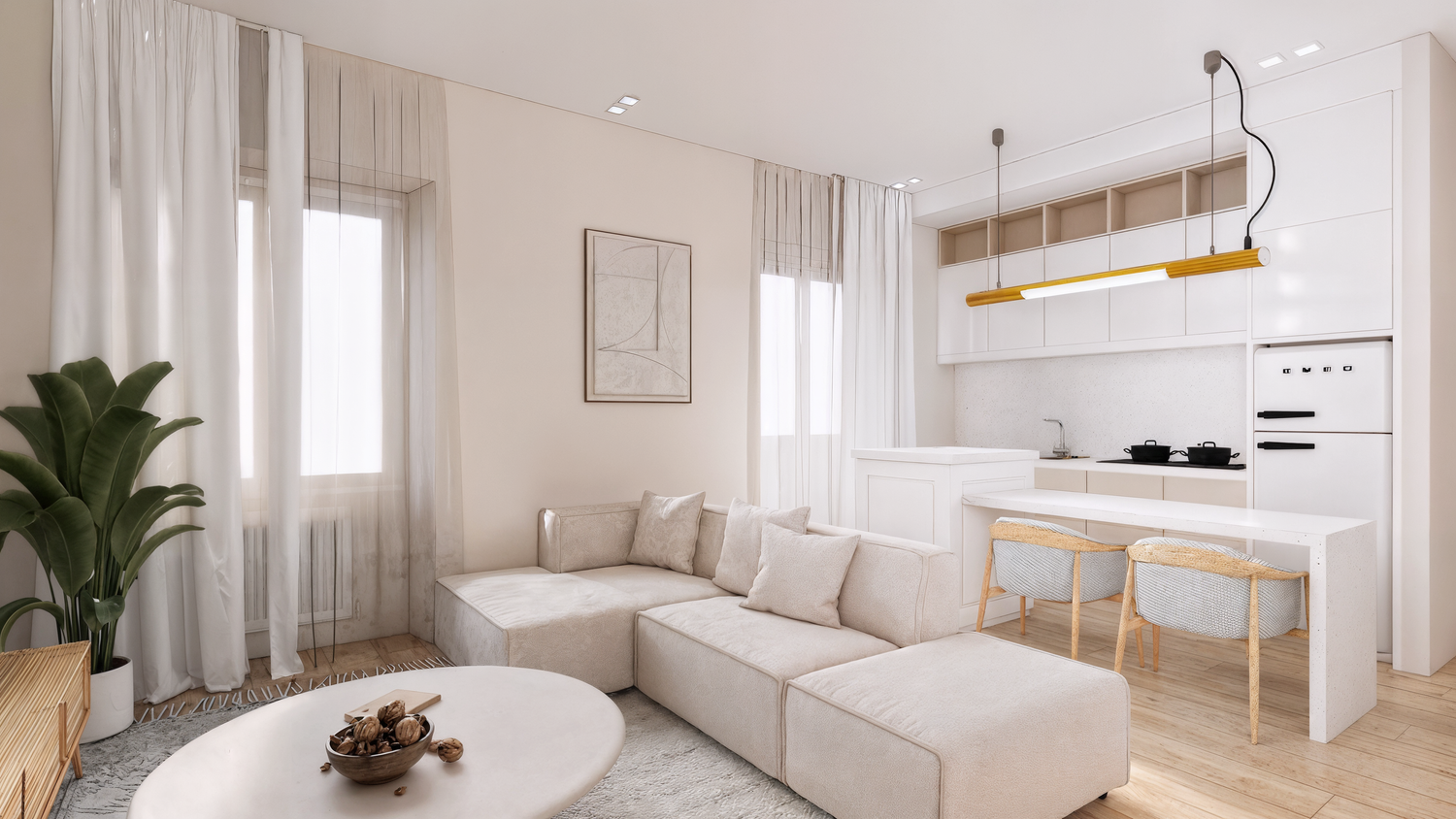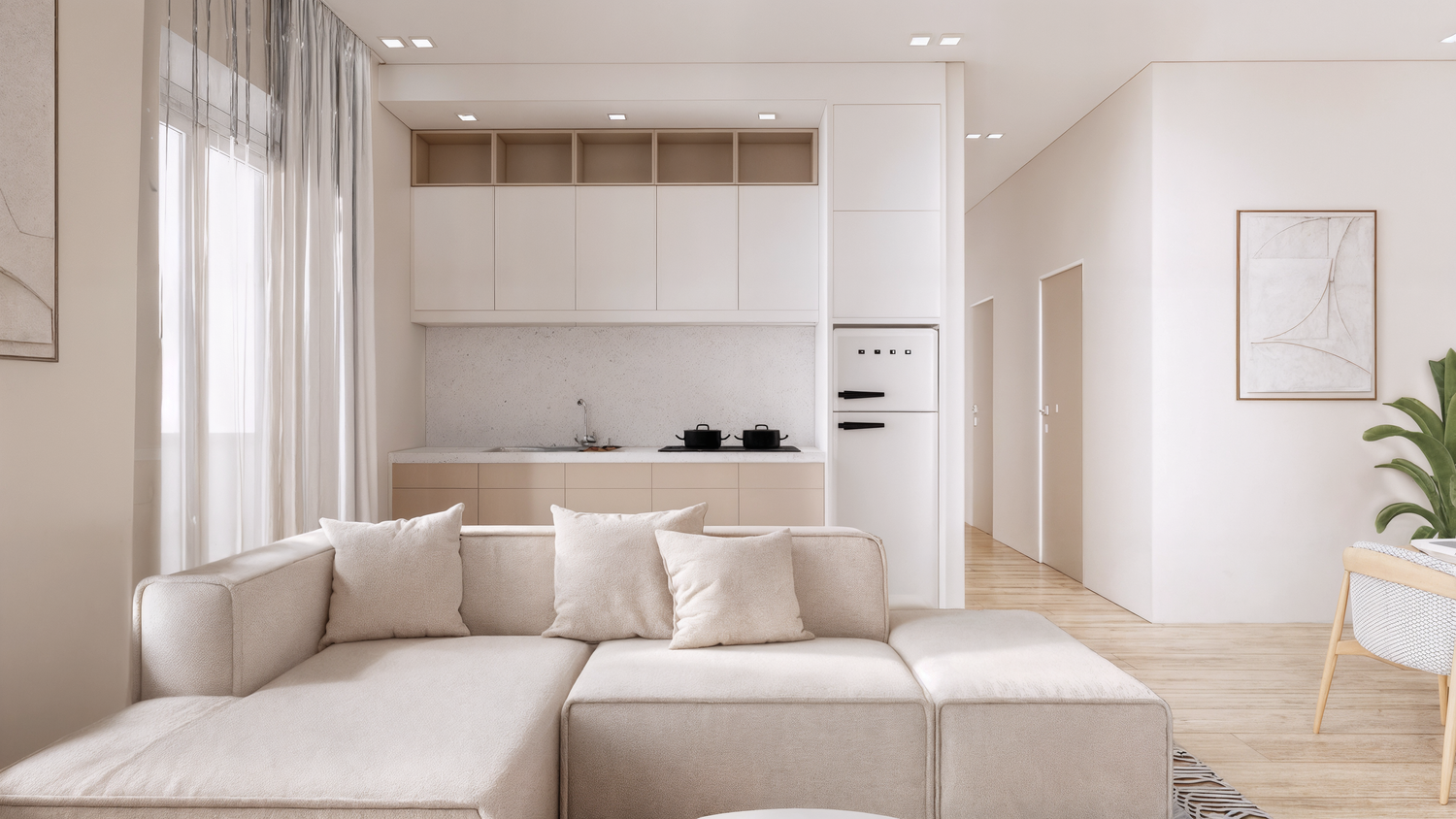 Il design è moderno, dominato dal bianco e dal crema, con tocchi di legno sui pavimenti e su alcuni mobili.