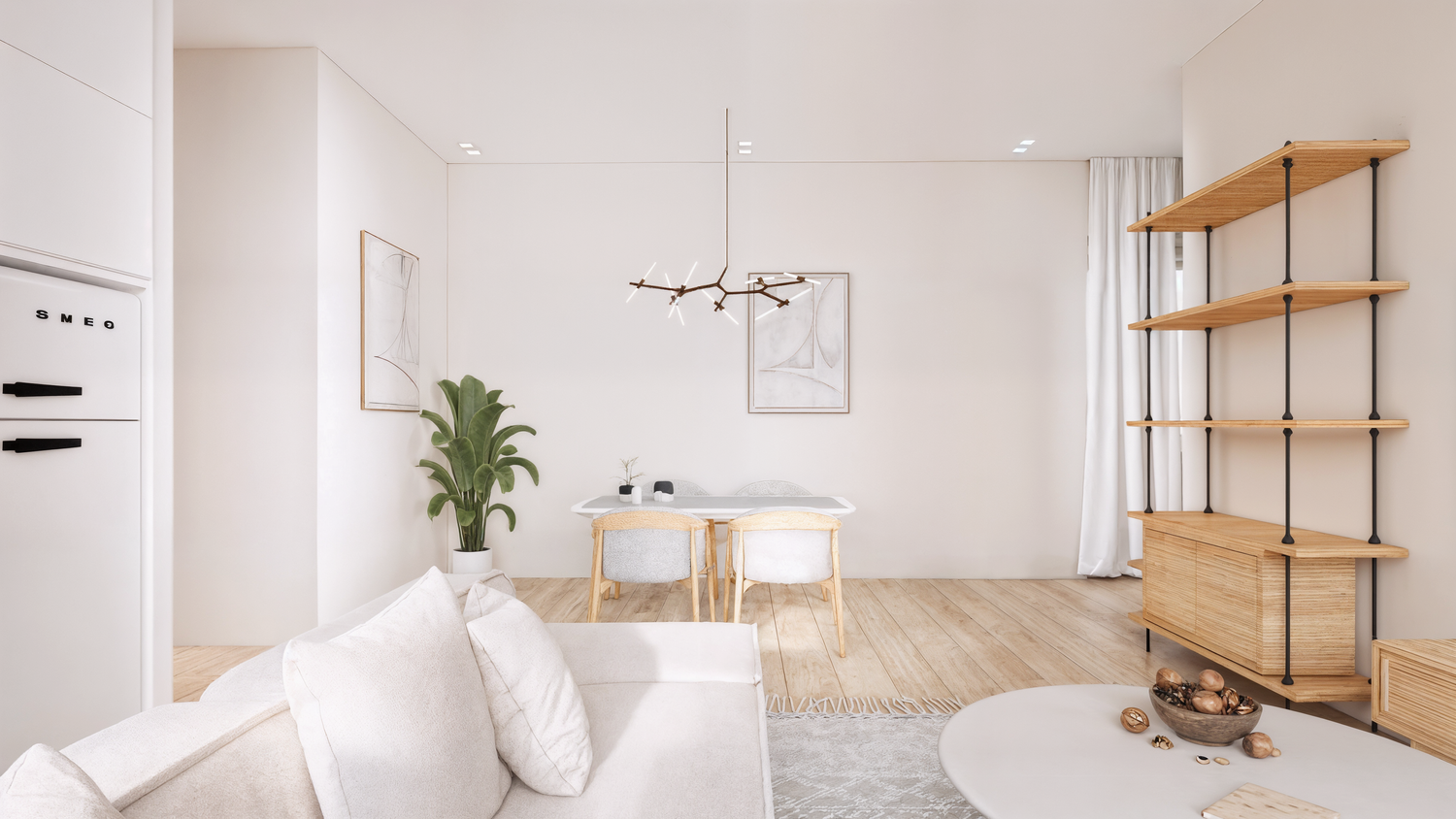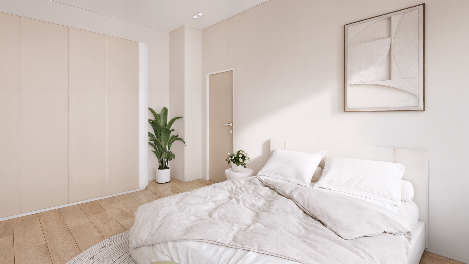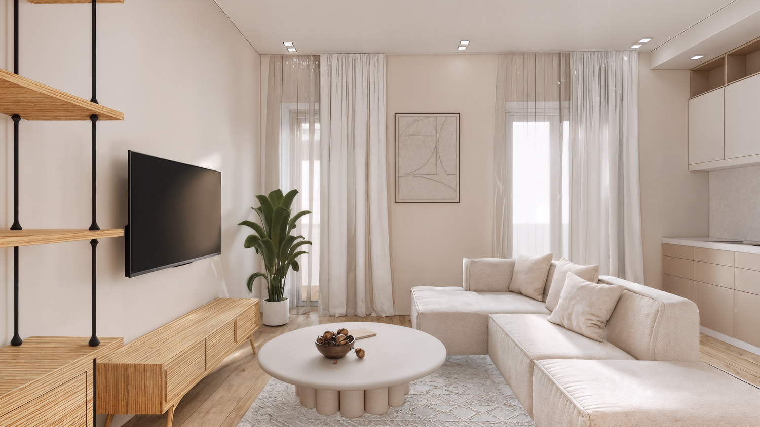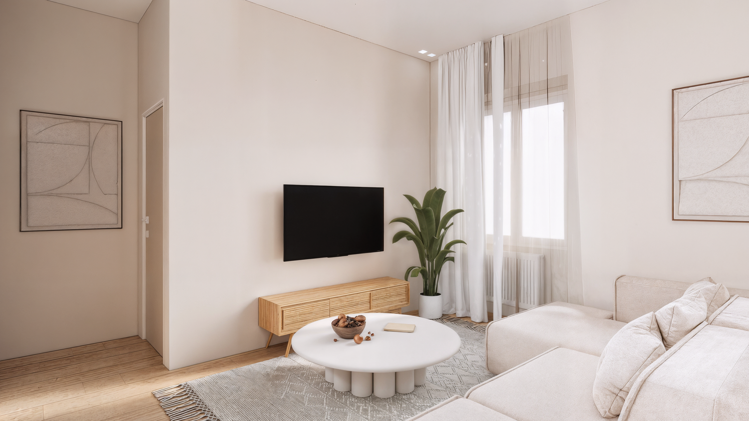 Il design è moderno, dominato dal bianco e dal crema, con tocchi di legno sui pavimenti e su alcuni mobili.