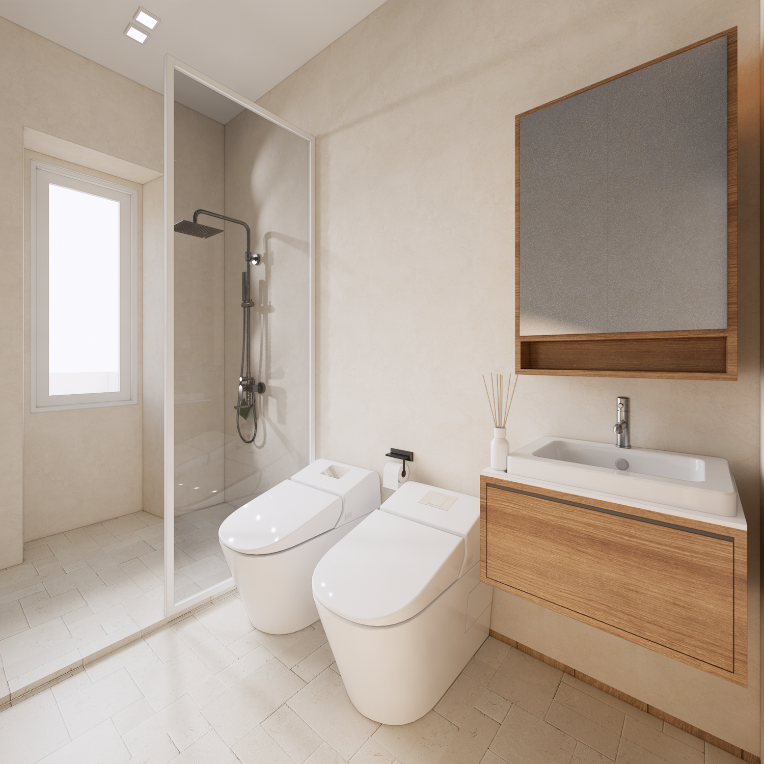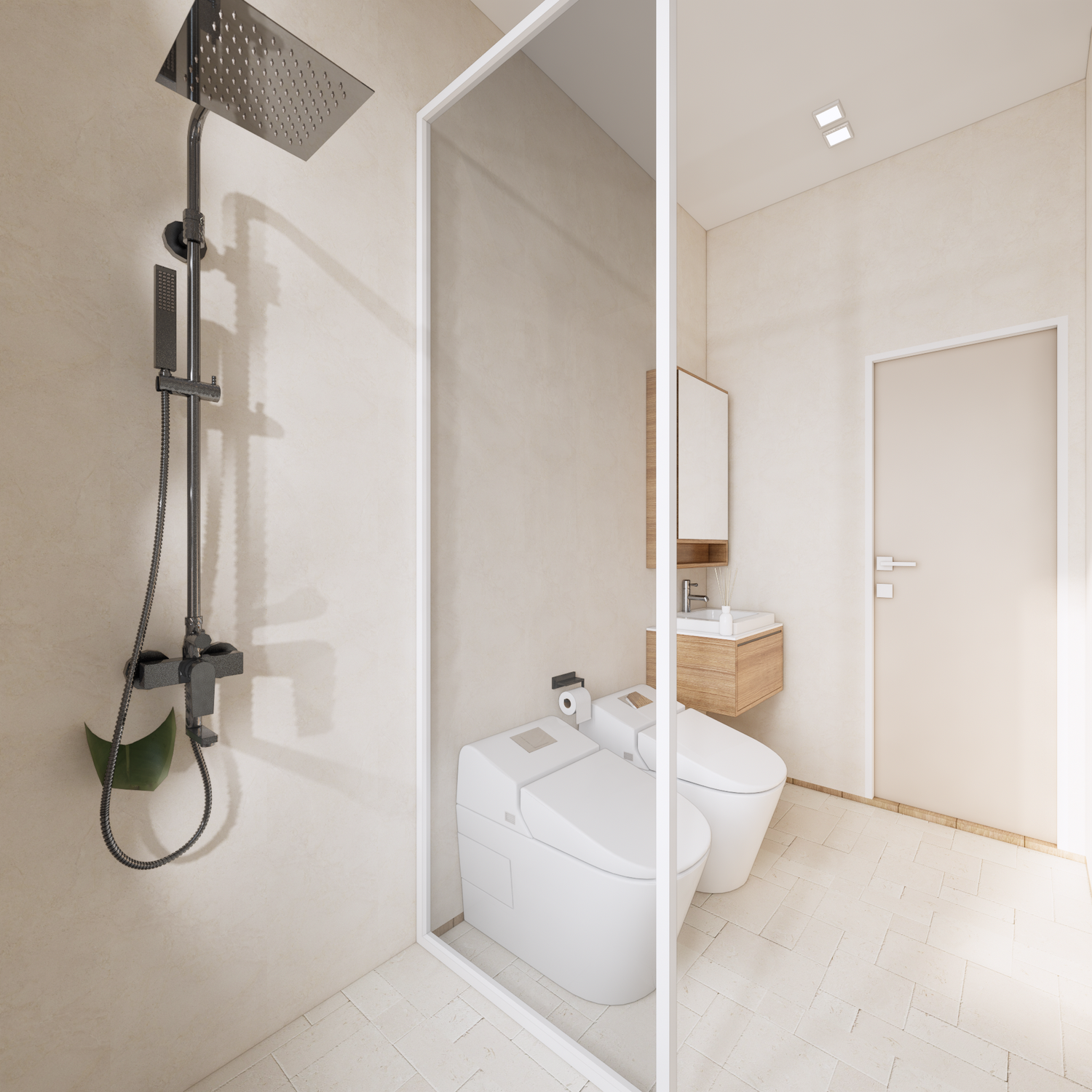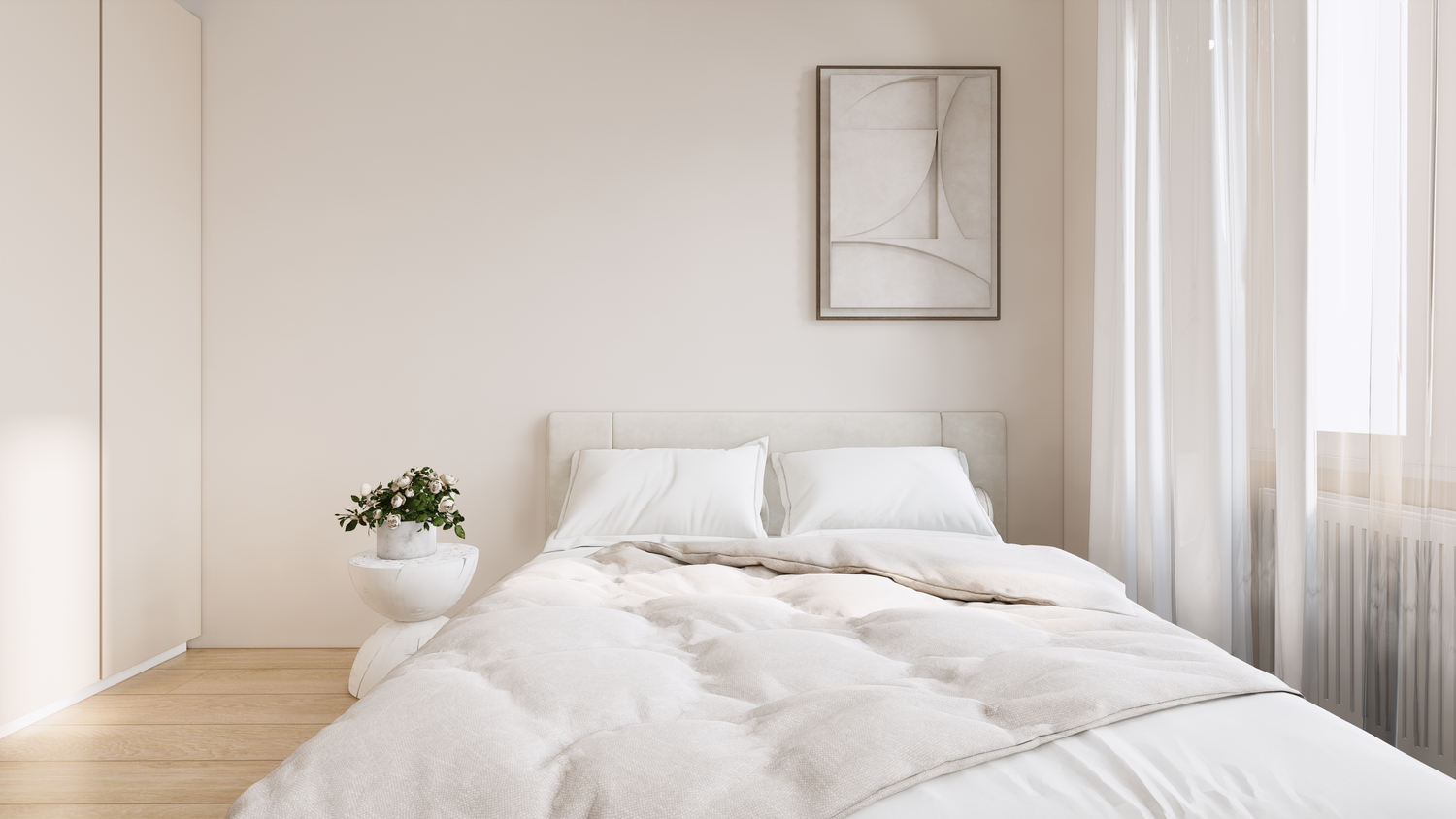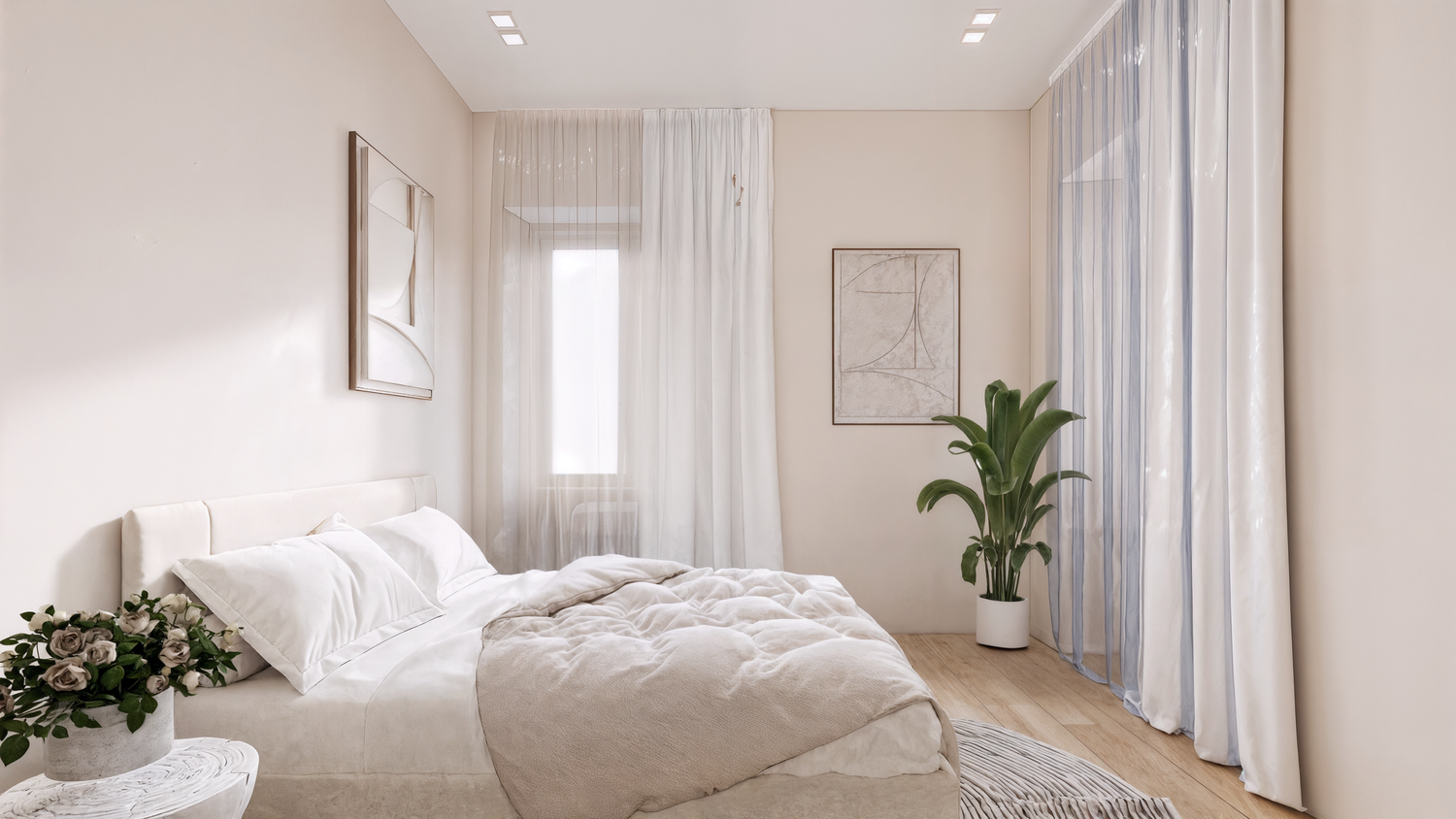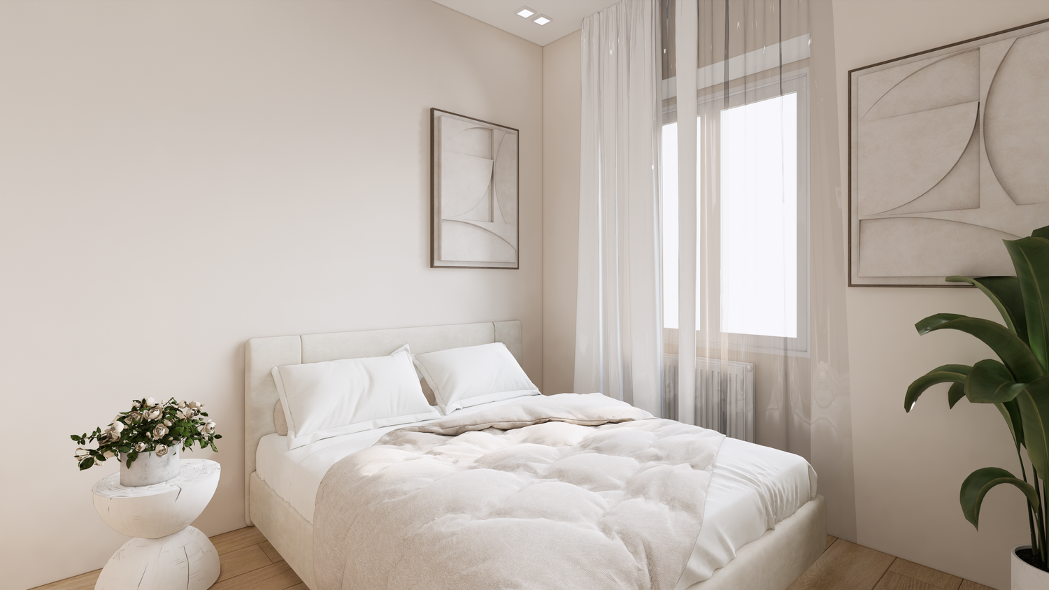 Il design è moderno, dominato dal bianco e dal crema, con tocchi di legno sui pavimenti e su alcuni mobili.