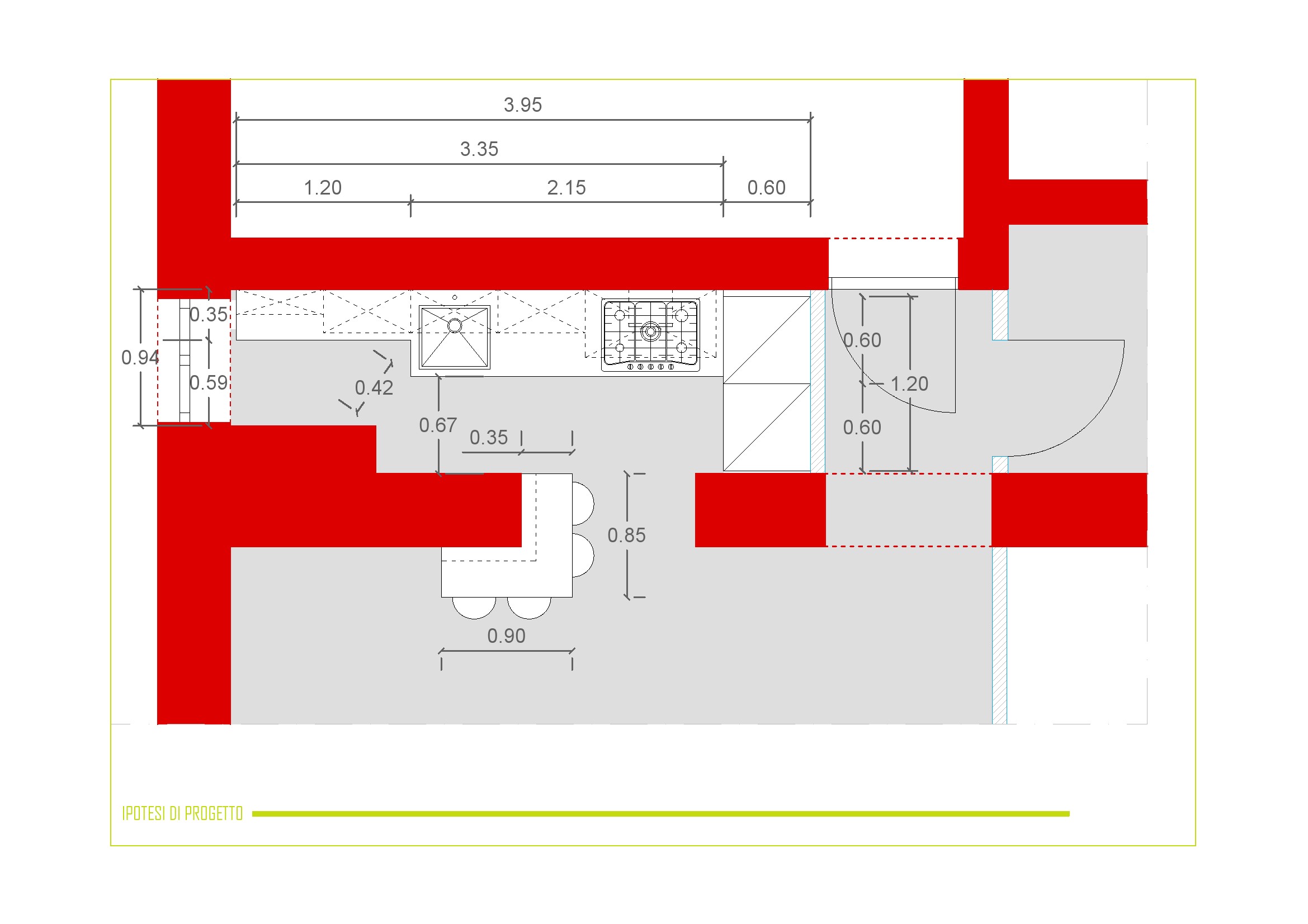 L'angolo cottura è come da piantina un po' piccola e sacrificata, la parete in basso sarà abbattuta per recuperare in Lunghezza, si tratta di quella vicino alla porta d'ingresso lasciandola poi a vista.