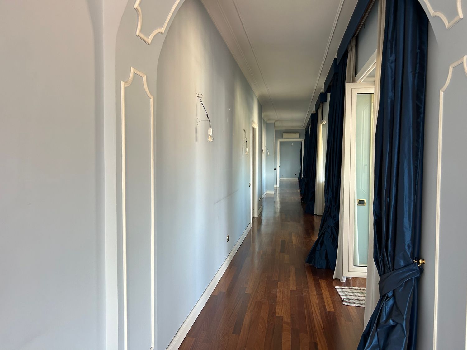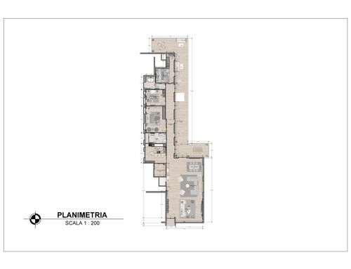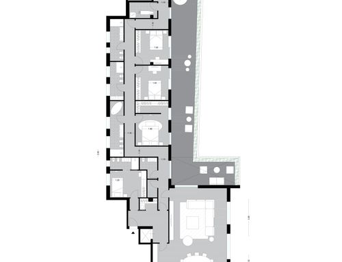 A service room with a bathroom needs to be created, as well as a guest bathroom, three bedrooms with two or three bathrooms, and we would like to minimize the corridor as much as possible, dedicating that space instead to the bedrooms at the end or to wardrobes for the rooms.