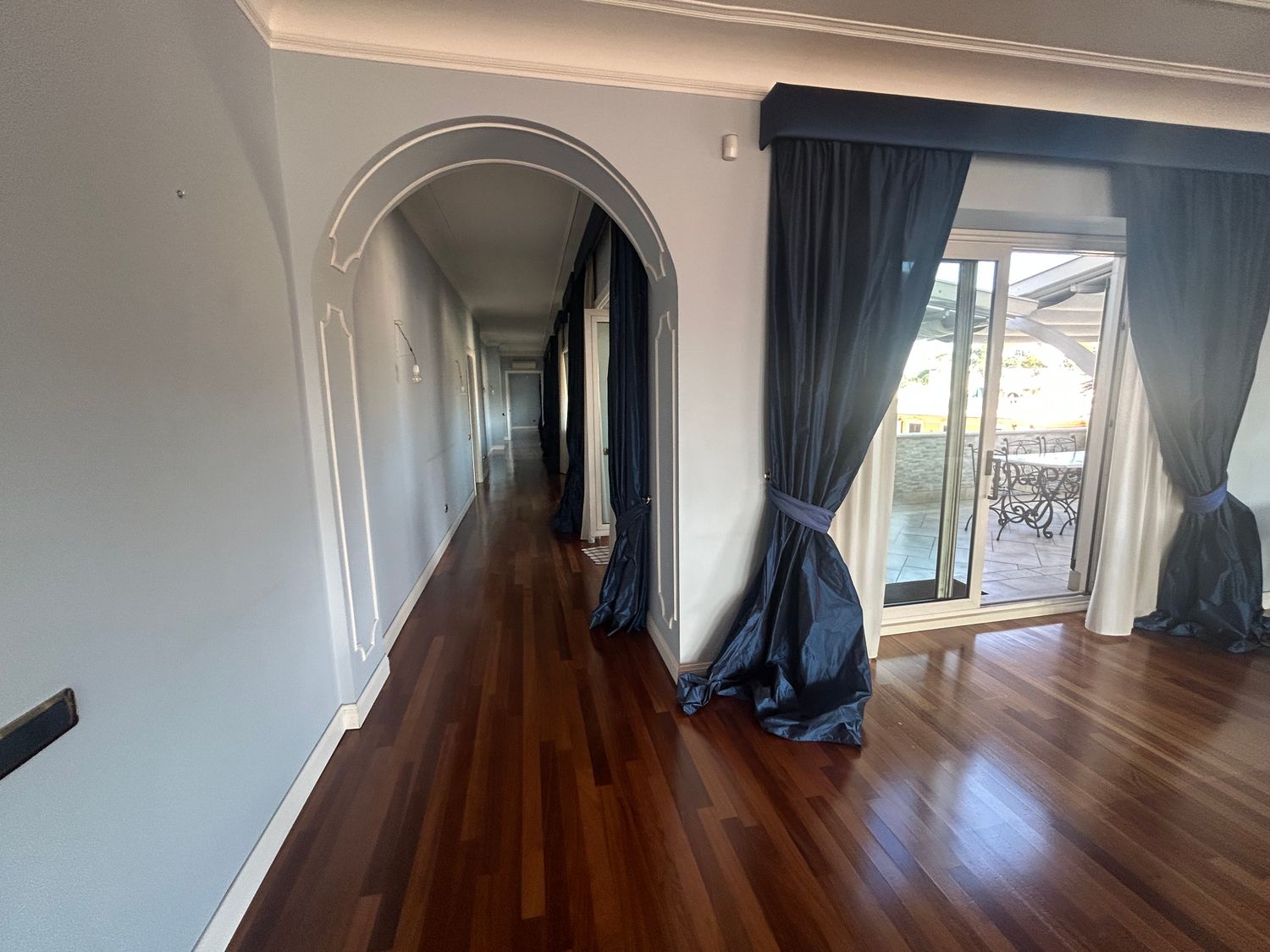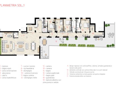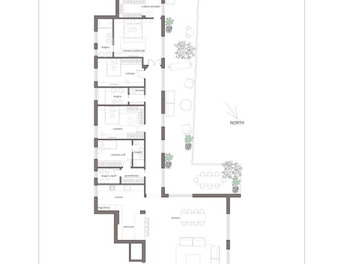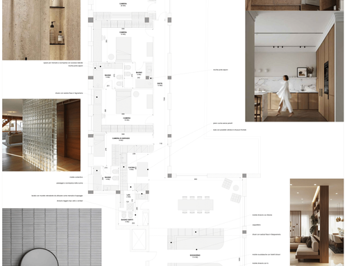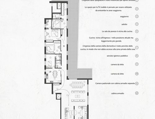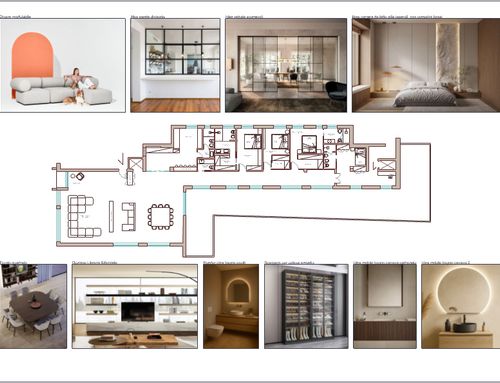 Vi riportiamo due planimetrie; la prima (su due fogli) è come era la casa in origine e la seconda come è attualmente ( salone open space ). Dovremmo ridistribuire gli spazi interni; l'ingresso principale sarà nel salone come nella prima planimetria. il salone, open space come nella seconda planimetria, andrà diviso solo con il mobilio in una zona tv con divano grande, un salotto con divani e una zona pranzo. La cucina andrà aperta il più possibile verso il salone ( dividendola magari con grande porta/vetrata scorrevole, ci farebbe piacere anche un'isola) preferiremmo evitare di spostare i mobili dalla zona segnata ma in caso di necessità per ricavare più spazio possiamo valutare alternative. Bisognerà poi creare una camera di servizio con bagno. Un bagno ospiti, tre camere con due/ tre bagni. Possibile ridurre un po' il corridoio da destinare alle camera in fondo o agli armadi delle camere. Come stile saremo orientati su uno stile japandi/ minimal scandinavo mixato ad elementi classici.