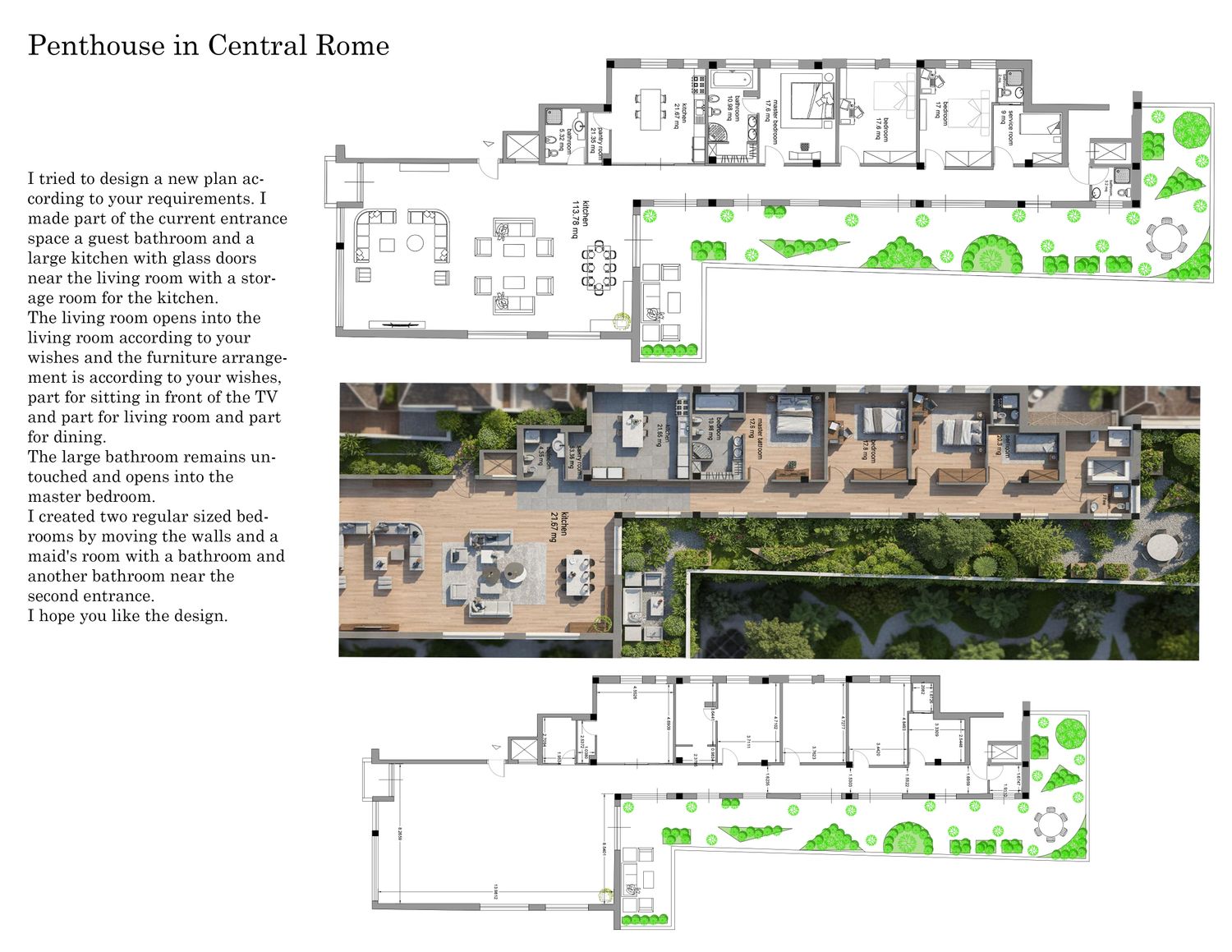 I created two regular sized bedrooms by moving the walls and a maid's room with a bathroom and another bathroom near the second entrance.