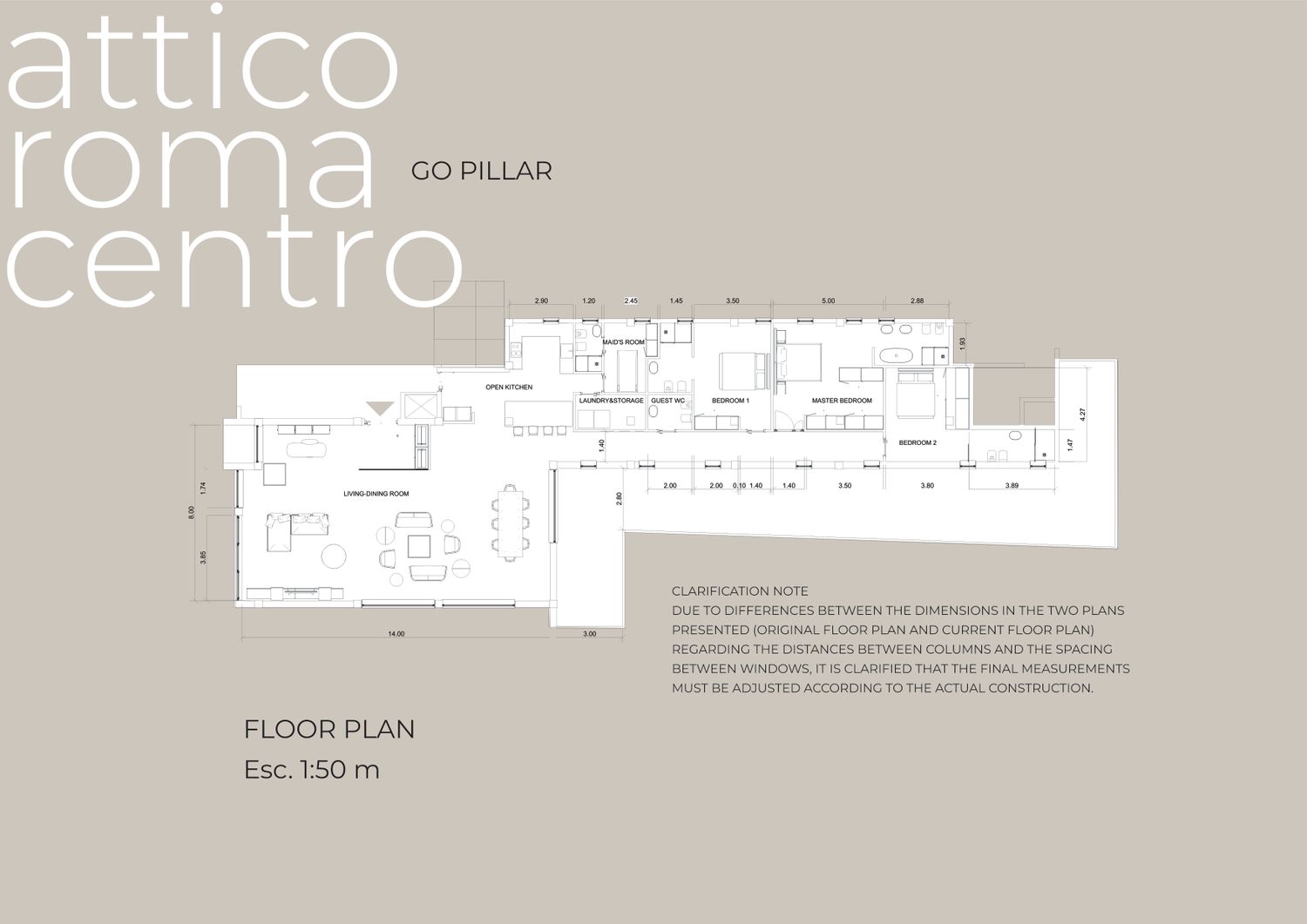 DUE TO DIFFERENCES BETWEEN THE DIMENSIONS IN THE TWO PLANS PRESENTED (ORIGINAL FLOOR PLAN AND CURRENT FLOOR PLAN) REGARDING THE DISTANCES BETWEEN COLUMNS AND THE SPACING BETWEEN WINDOWS, IT IS PLEASED THAT THE FINAL MEASUREMENTS MUST BE ADJUSTED ACCORDING TO THE ACTUAL CONSTRUCTION.