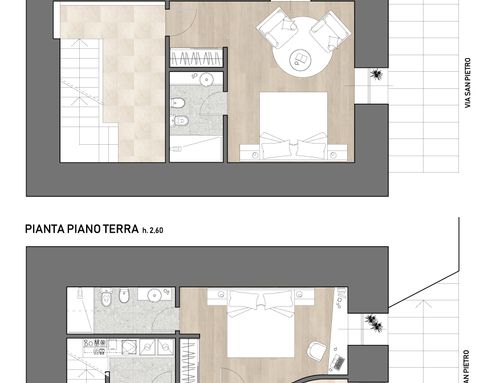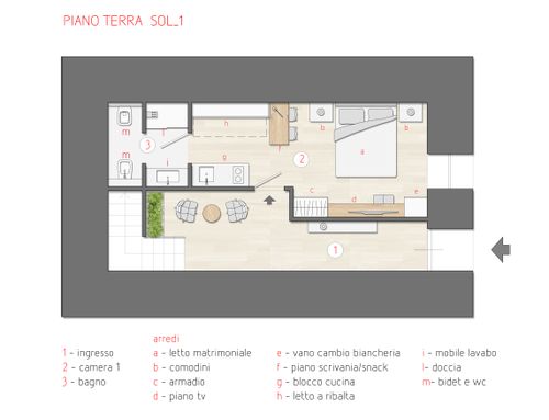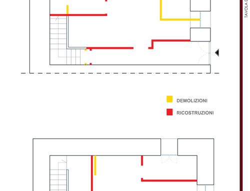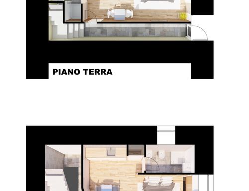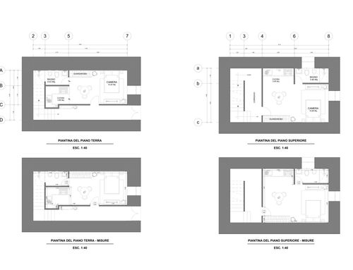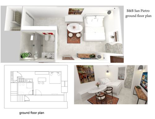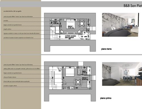 Realizzazione di un B&B creando un corridoio per accedere alla seconda stanza sul piano superiore in cui dovrà essere realizzato un bagno e il bagno esistente al piano inferiore potrà anche essere spostato su un altro lato della stanza.