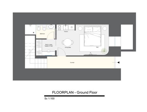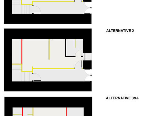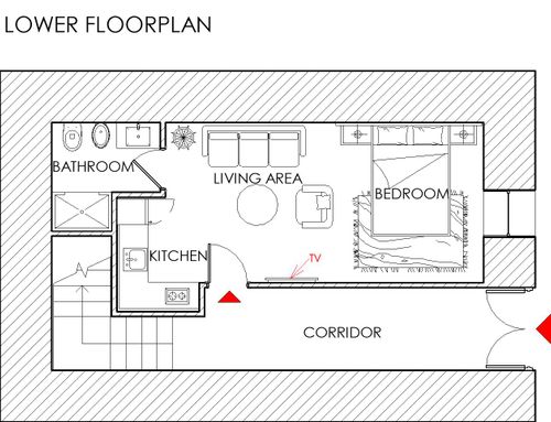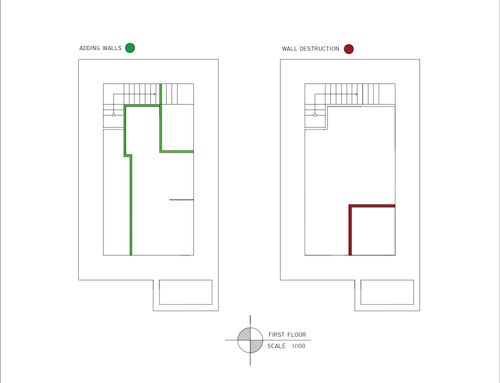Establecimiento de un B&B creando un pasillo para acceder a la segunda habitación en el piso superior, donde se deberá construir un baño. El baño existente en el piso inferior también puede ser trasladado a otro lado de la habitación.