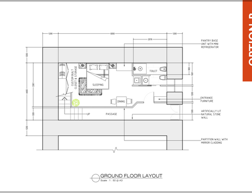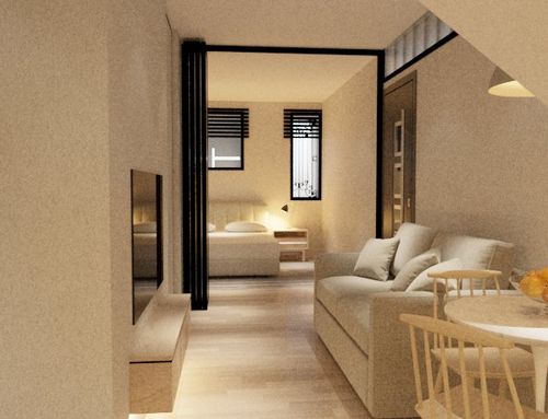 Establishment of a B&B by creating a corridor to access the second room on the upper floor, where a bathroom will need to be constructed. The existing bathroom on the lower floor can also be relocated to another side of the room.