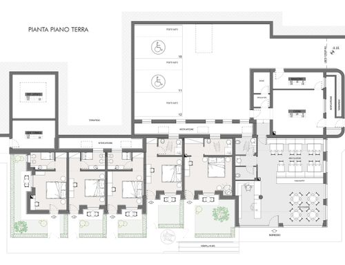 In this contest we ask only the rooms on the upper floor to be examined, we would like them to be small jewels, elegant and light suites. and the breakfast room. If possible some ideas for the outside, it would surely make us useful. On the upper floor, we would like the room to have its own private garden. Since the rooms are not large, I would like to have an added value with the private garden, a continuity of the room, where in total privacy, the customer can relax ( It is also possible to have an external mini spa in the outdoor room), ...play with the children or dog in total safety.