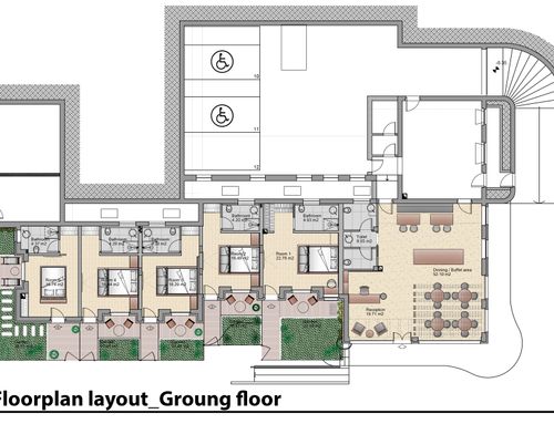 The breakfast room will be set up for about 25 people, but if necessary they should also double, there will have to be a small reception, and a buffet area. We wouldn't mind a stone floor. Everything as shown in the plan, attached.