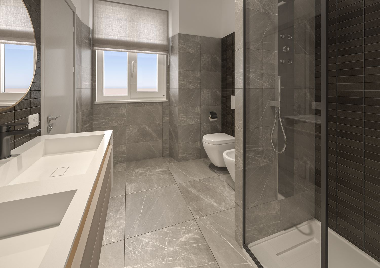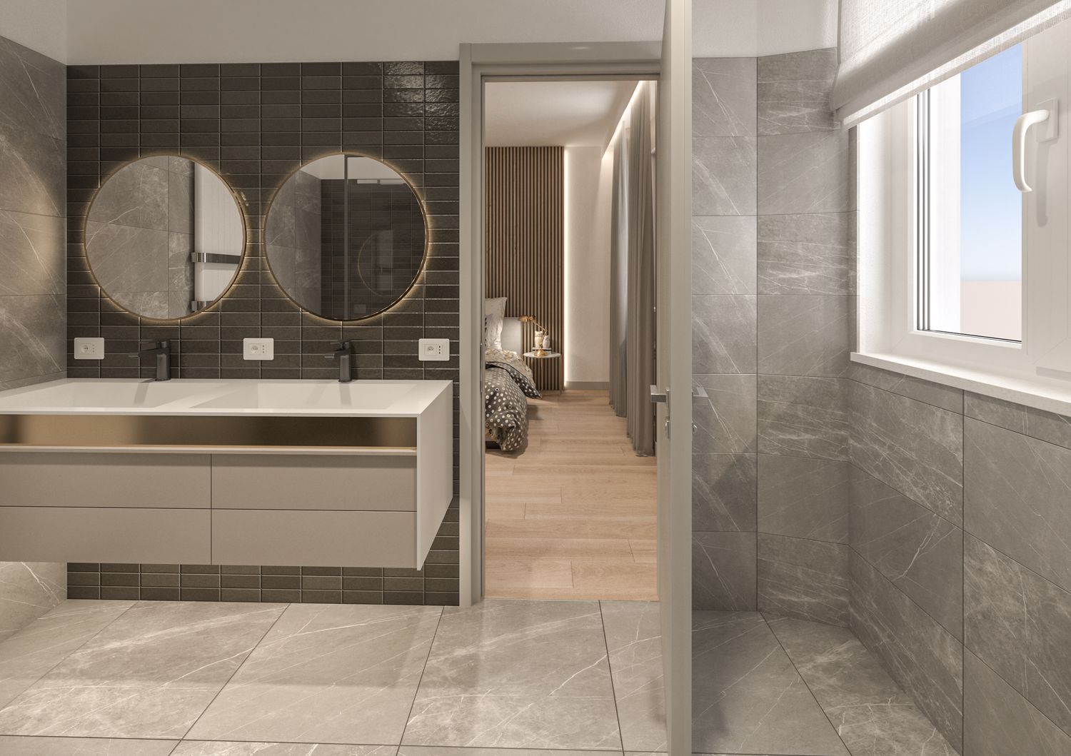 Ogni unità è concepita come una suite autonoma, organizzata in modo chiaro e funzionale. La distribuzione interna prevede una zona giorno (dove la dimensione lo consente) con angolo cottura integrato in un arredo compatto, una zona notte e un bagno privato progettato come spazio di benessere, con docce ampie e, ove possibile, una separazione tra area WC/bidet e zona lavabo.