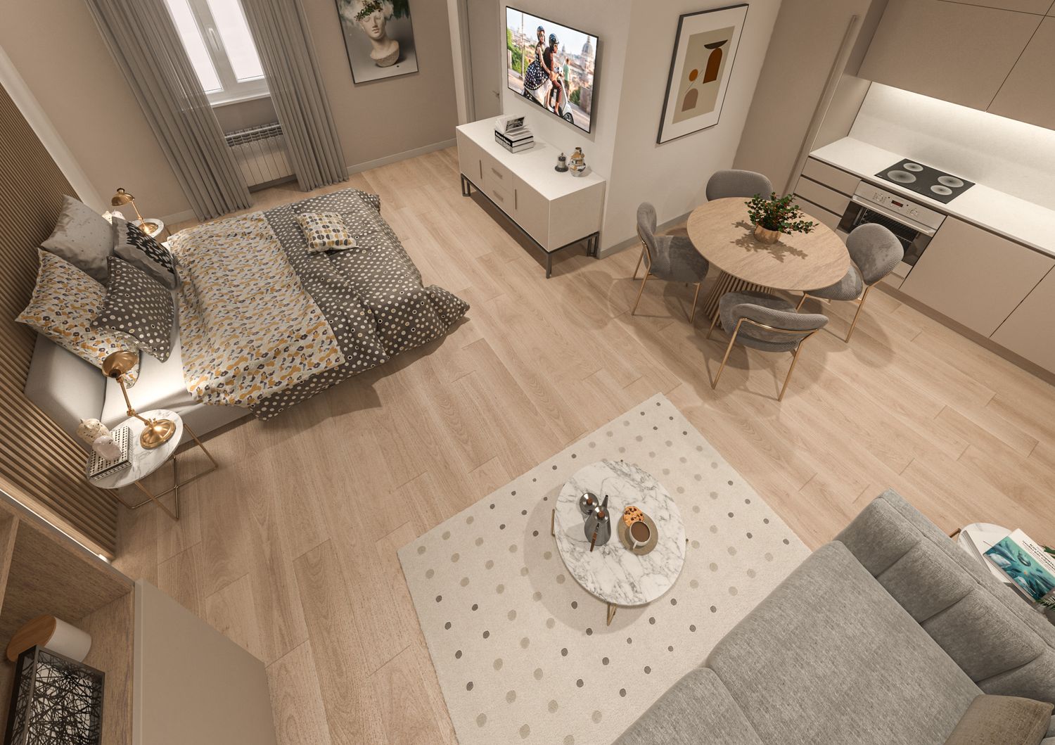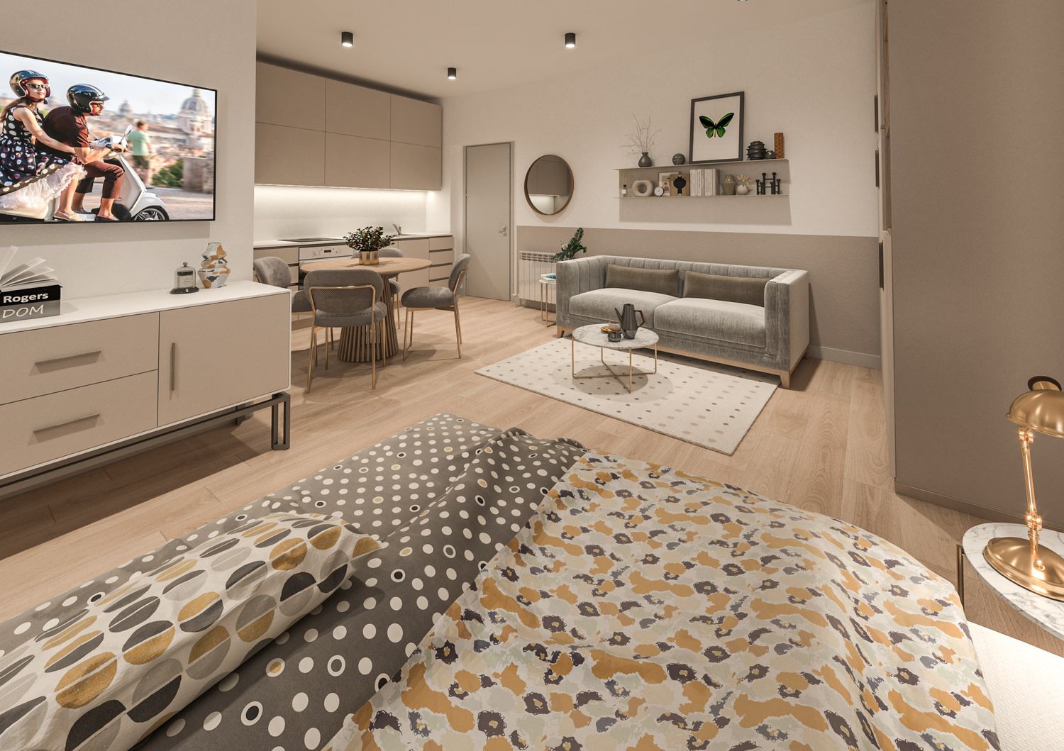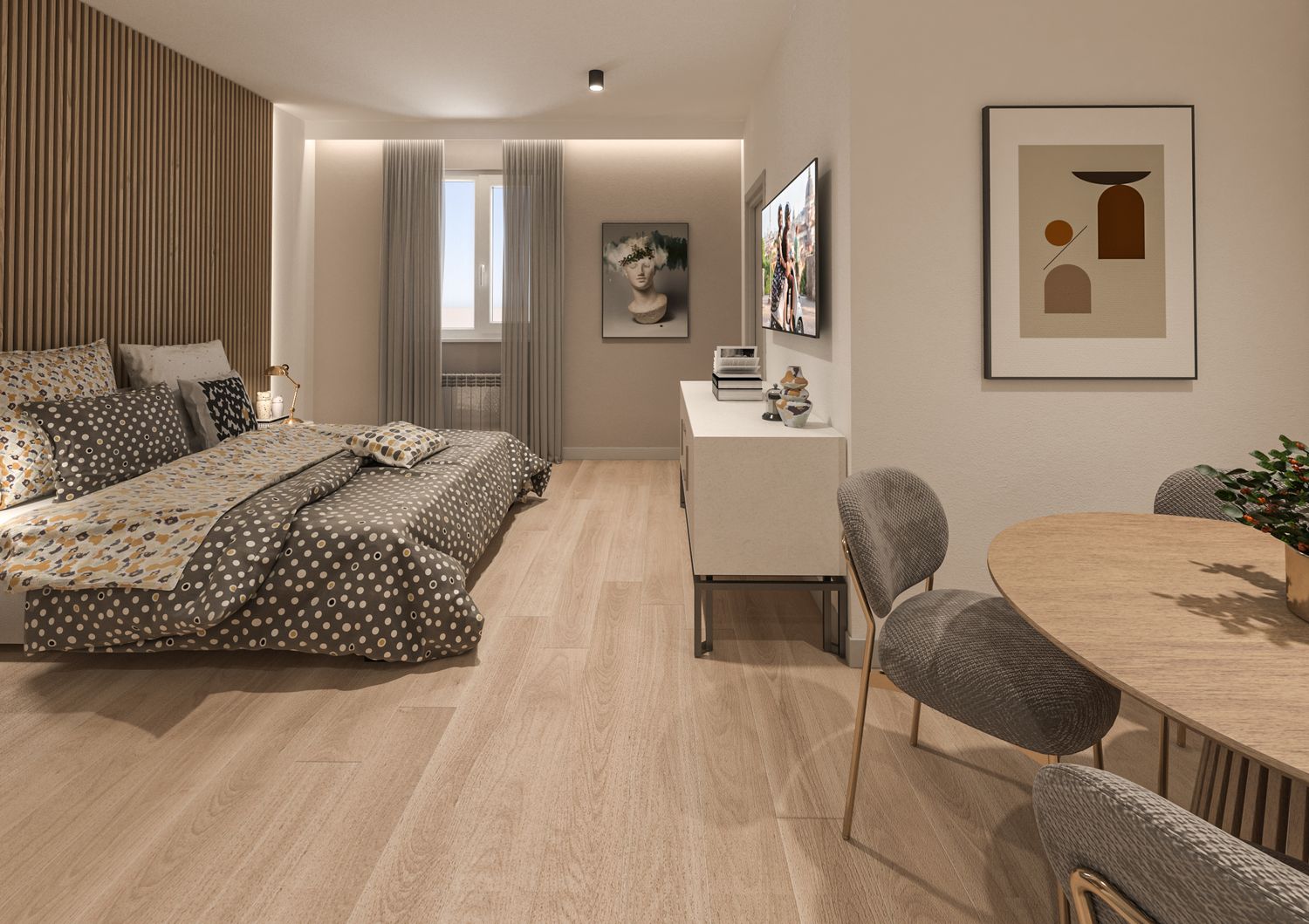 A completamento della proposta, il progetto è accompagnato da render fotorealistici della camera B104, presentata come camera tipo e riferimento per finiture, atmosfera e qualità spaziale dell’intero Bed and Breakfast.