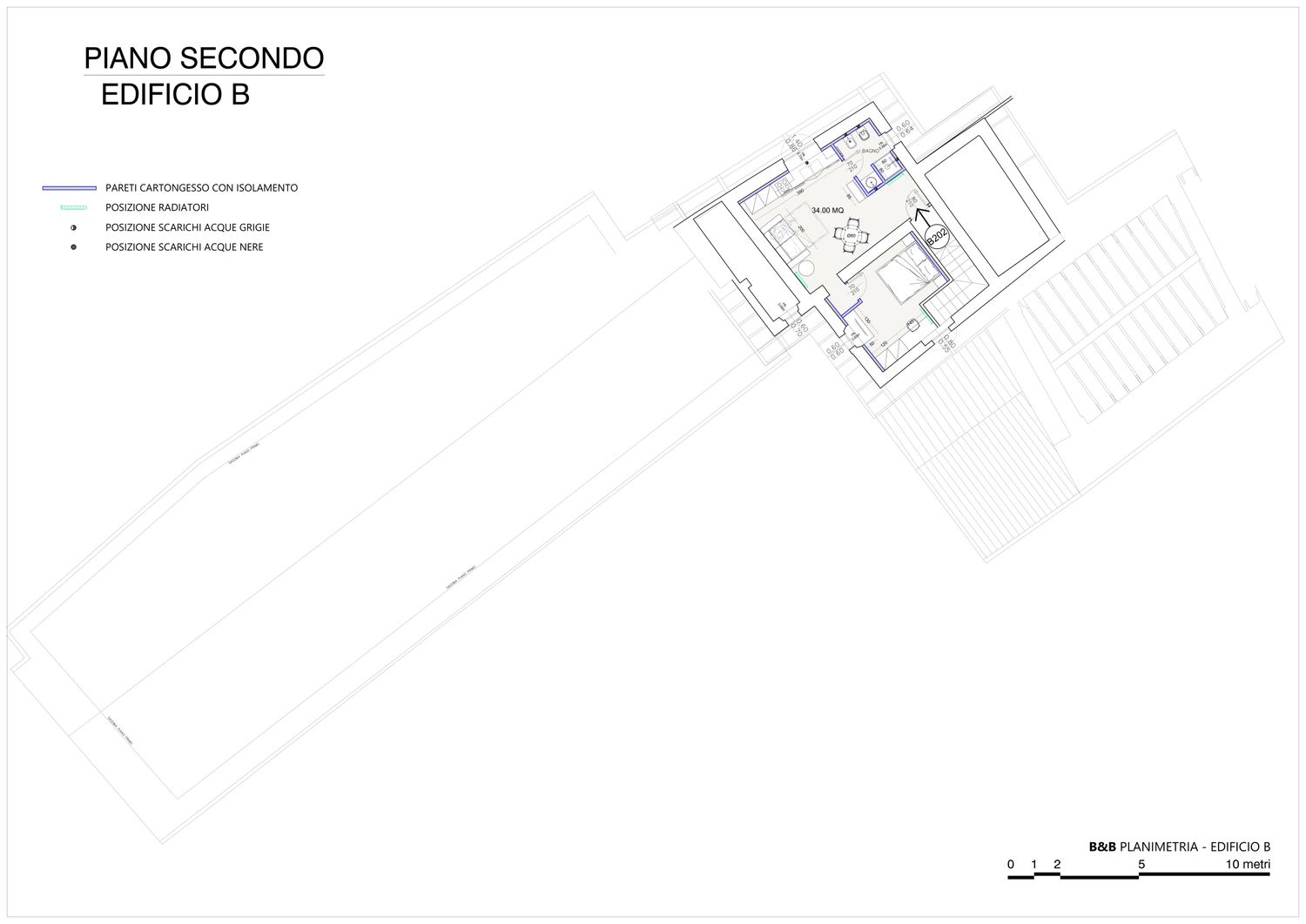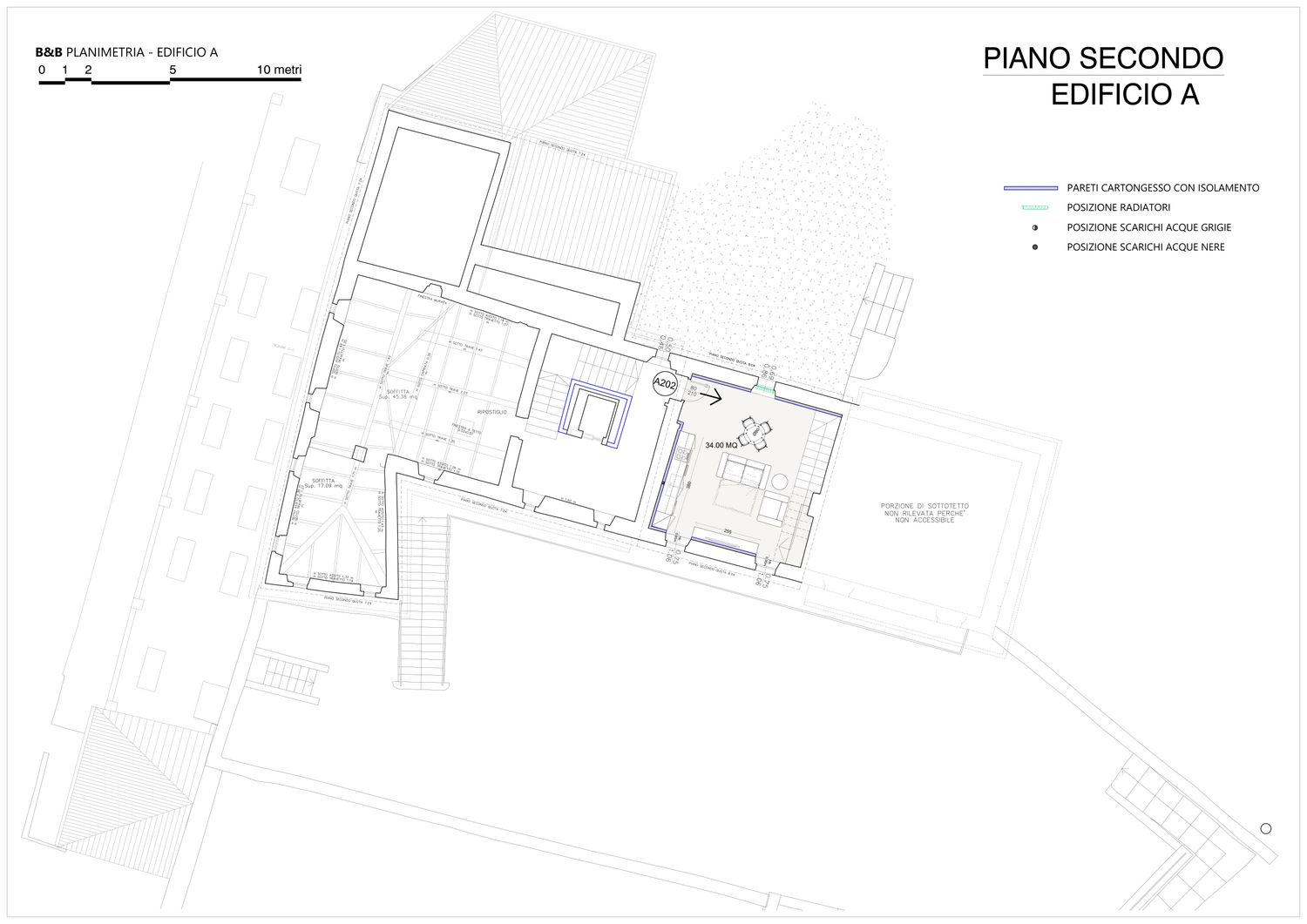 La villa è composta da due edifici distinti, oggetto di un intervento puntuale e reversibile che interessa esclusivamente gli ambienti indicati negli elaborati di progetto. Il vincolo della Soprintendenza, che non consente demolizioni né modifiche strutturali, diventa occasione progettuale: tutte le nuove partizioni interne e contropareti perimetrali sono realizzate in cartongesso isolate, garantendo reversibilità, miglioramento delle prestazioni e massimo rispetto del patrimonio storico.