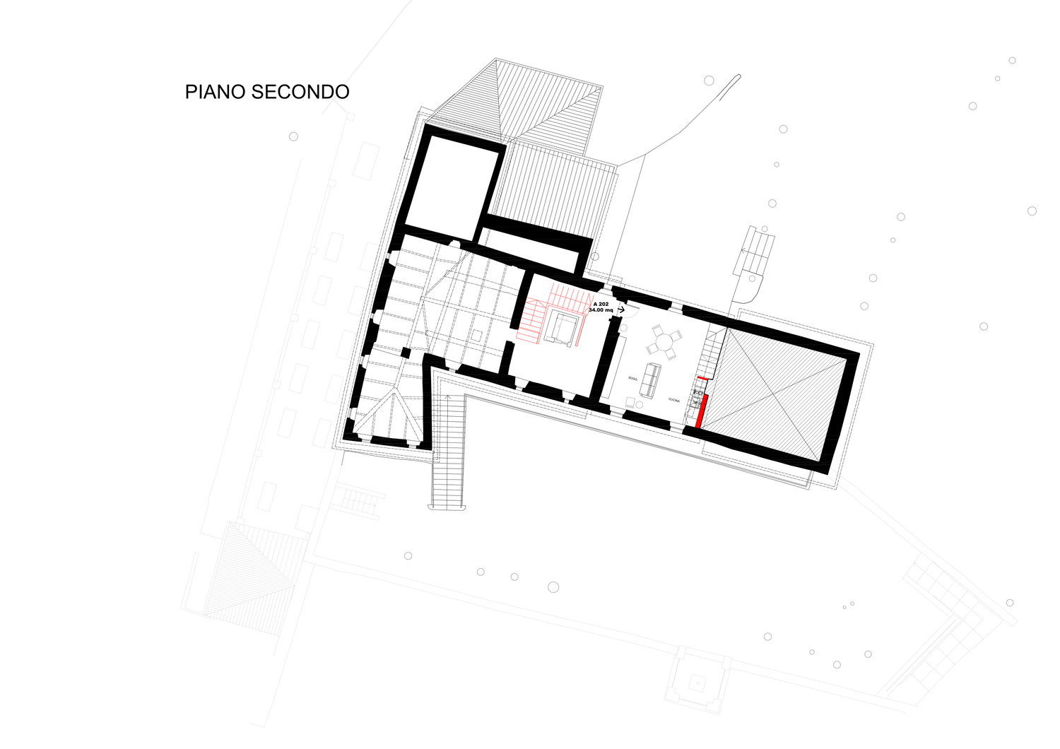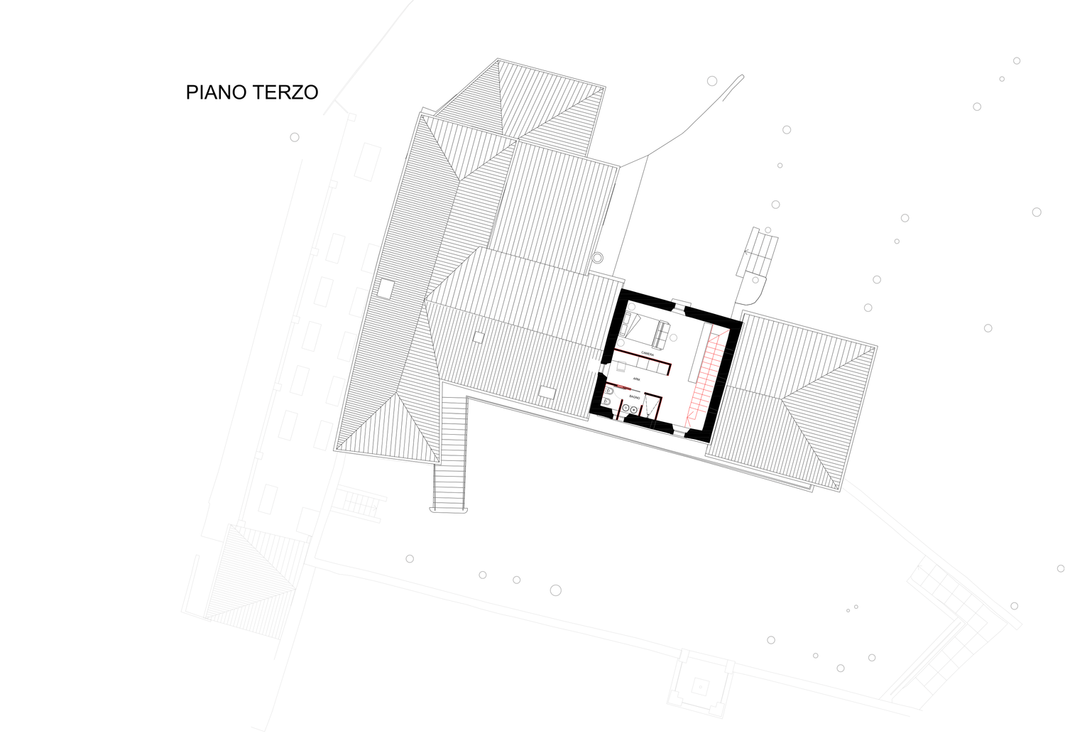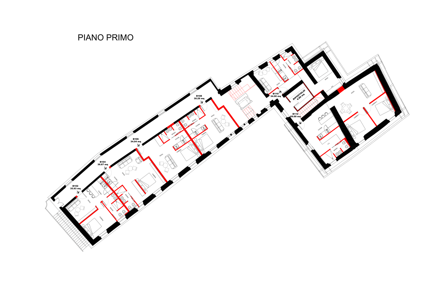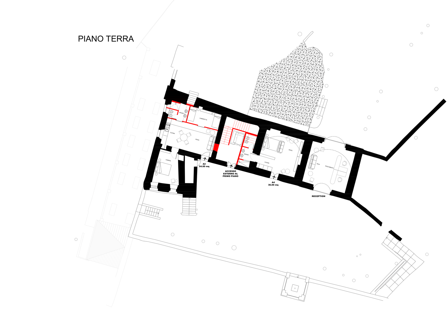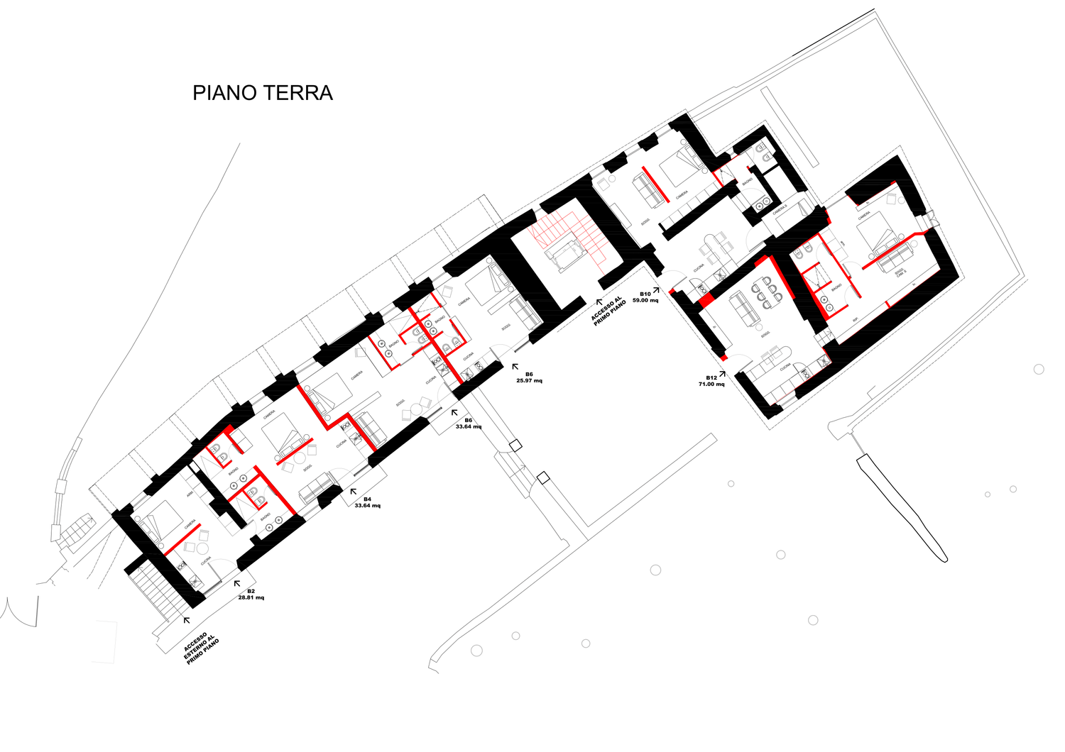 Blocco A: si sviluppa su 3 livelli con una distribuzione frammentata. Le camere seguono uno schema tradizionale di ambienti chiusi e indipendenti, garantendo la privacy convenzionale.