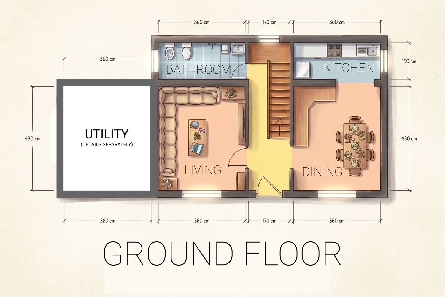 Minimal alteration concept. Since the bathroom cannot open into living room directly (according to the rules) its entrance is under the staircase. Note, I have interchanged Living and Dining as I feel that is more appropriate. Note, you can have a door in the Living Room to access the Utility Area if you desire. Also note, the steps need to have a raiser height of 16 cm (6 inches). About the bathroom in the first floor, I have attached it to the bedroom as that's more appropriate now due to the fact that you now have a common bathroom on the ground floor. Hope this helps.