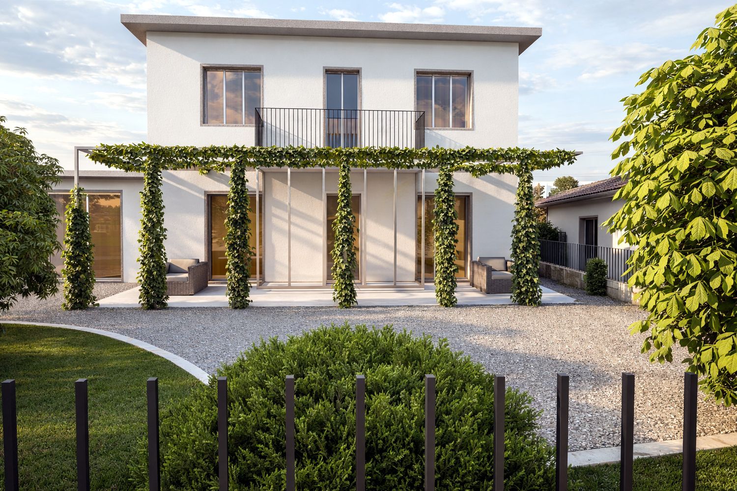 Esternamente in corrispondenza dell’ingresso è stata pensata una pergola in acciaio con del verde rampicante.