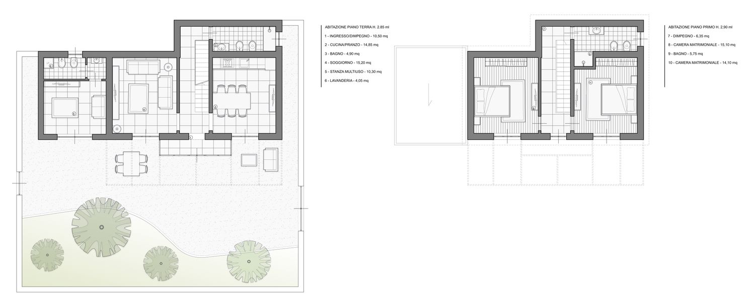 In corrispondenza del balcone in aggetto ho pensato di realizzare un bow-window di ingresso, dalla quale si accede all’interno dell’abitazione. Nel disimpegno è stata realizzata una scala ad un’unica rampa in legno con una libreria nella parte bassa. Verso il lato nord è stato realizzato il primo bagno di servizio. Dall’ingresso troviamo nella stanza di destra la cucina e la zona pranzo mentre nella stanza di sinistra troviamo la zona soggiorno, inoltre in questi ambienti al posto delle finestre sono state pensate delle porte finestre, in modo tale da avere l’accesso diretto verso il giardino.