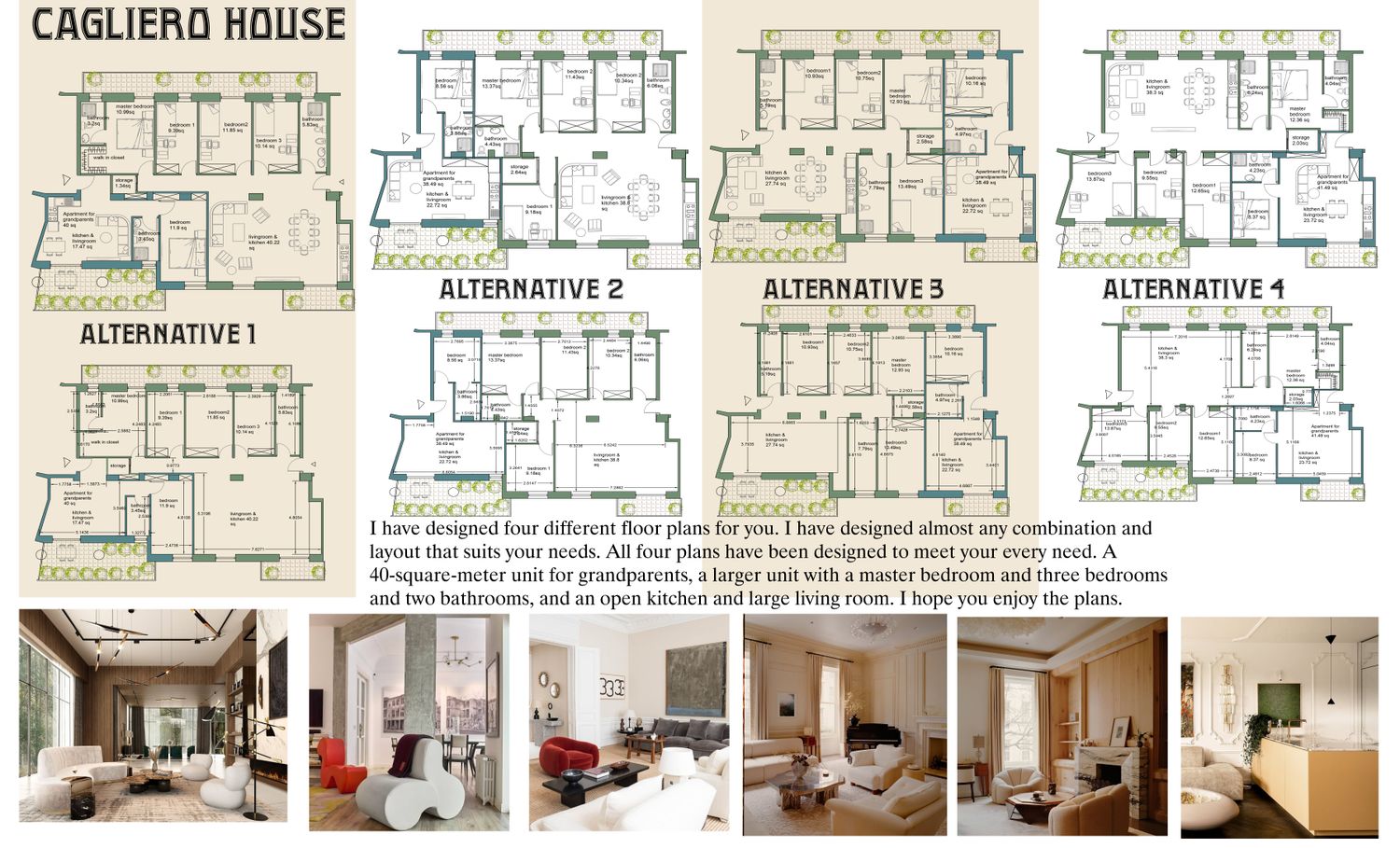 I have designed four different floor plans for you. I have designed almost any combination and layout that suits your needs. All four plans have been designed to meet your every need. A 40-square-meter unit for grandparents, a larger unit with a master bedroom and three bedrooms and two bathrooms, and an open kitchen and large living room. I hope you enjoy the plans.