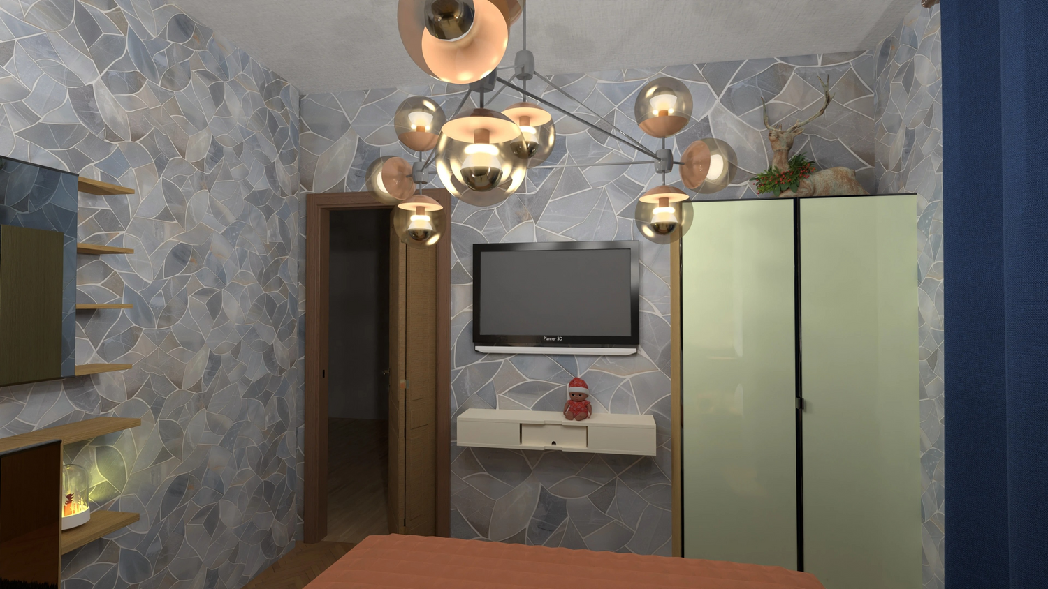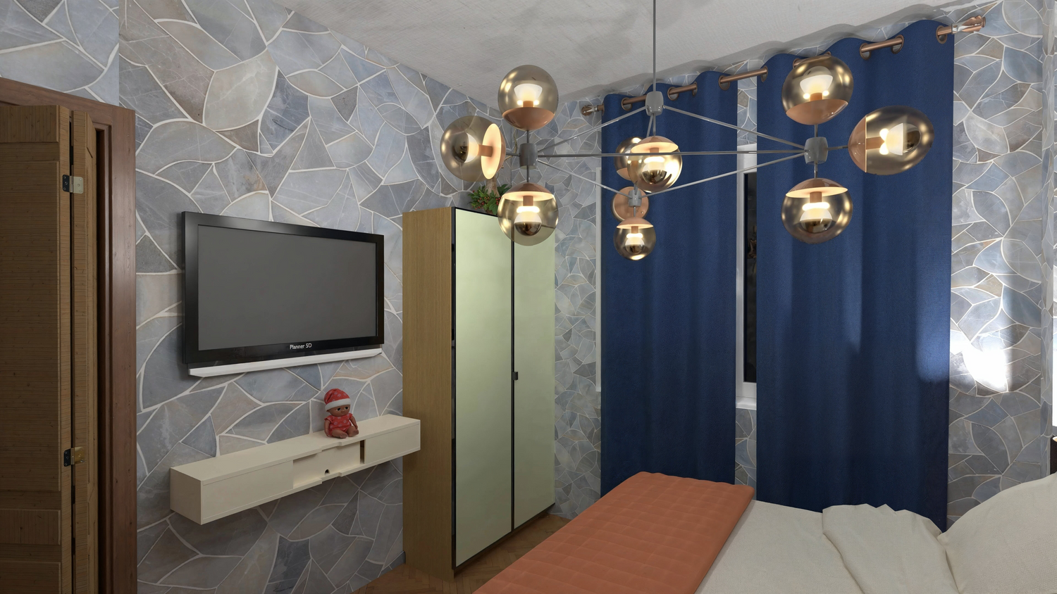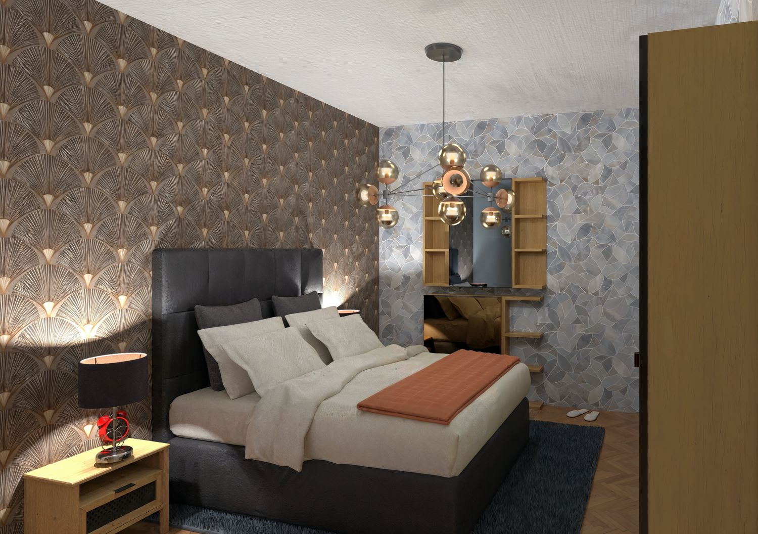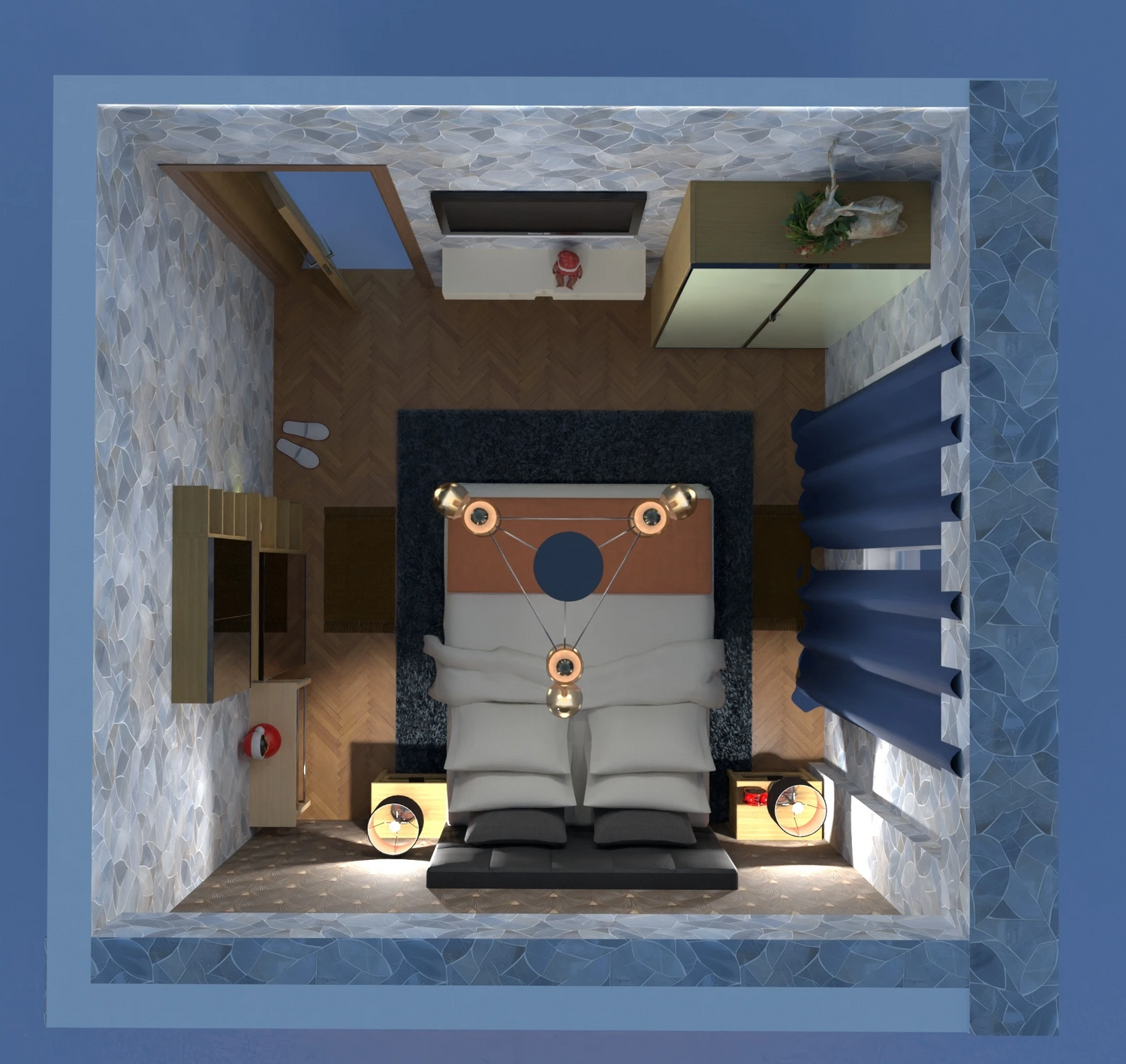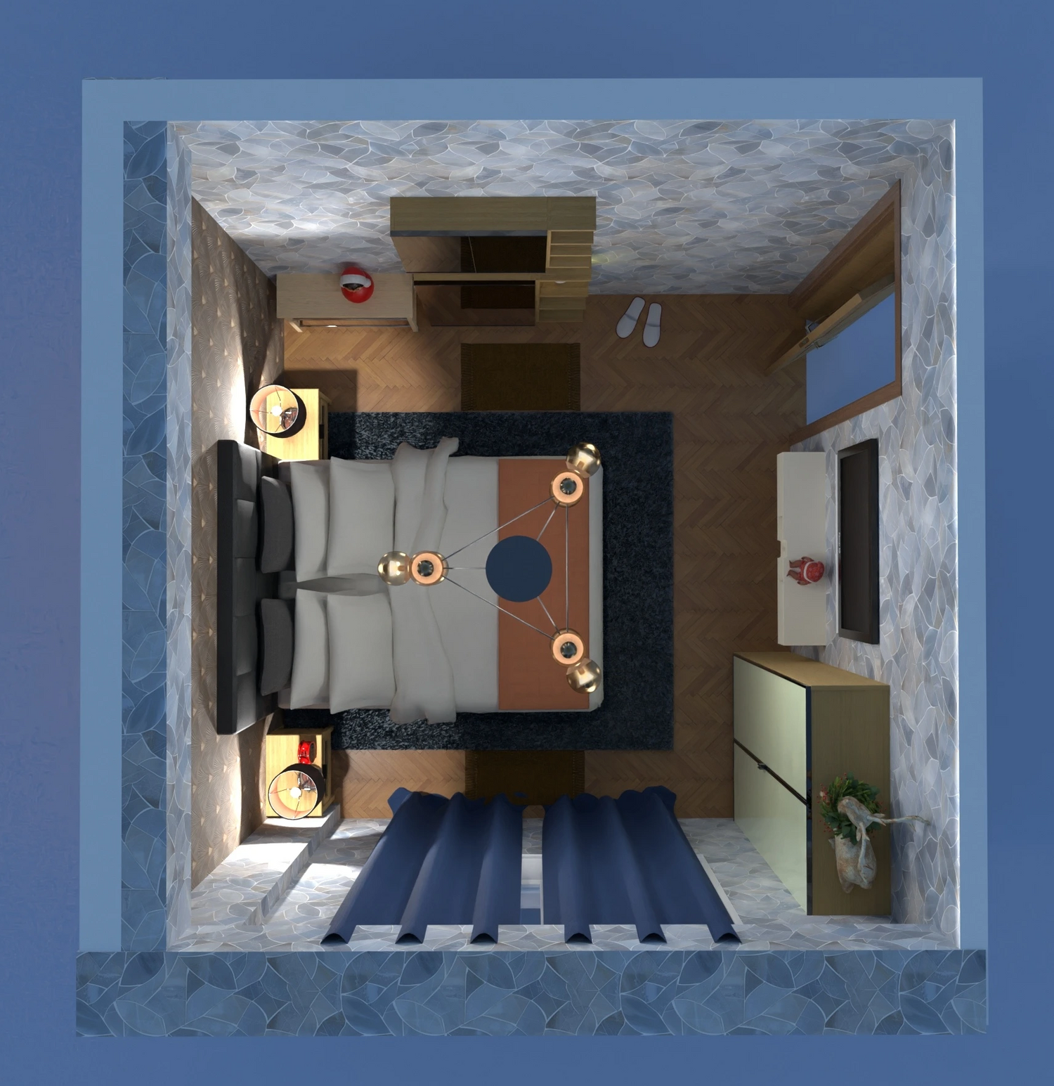 In addition, a relatively large wardrobe has been positioned on the wall facing the bed, next to the TV, as illustrated in the design, to provide sufficient and practical storage capacity.
