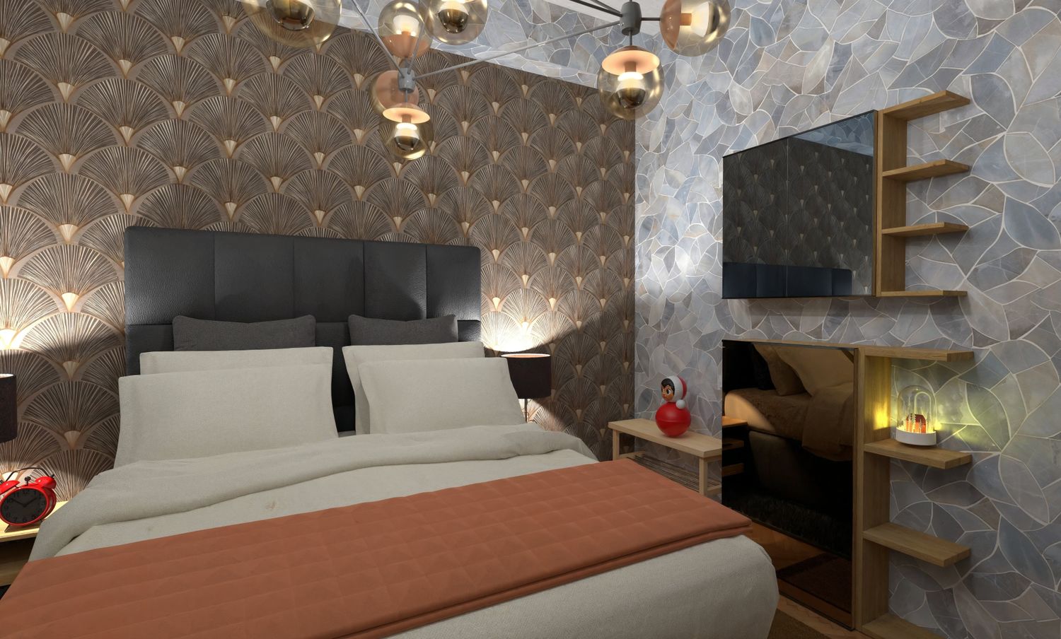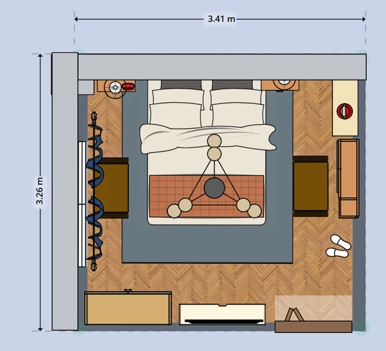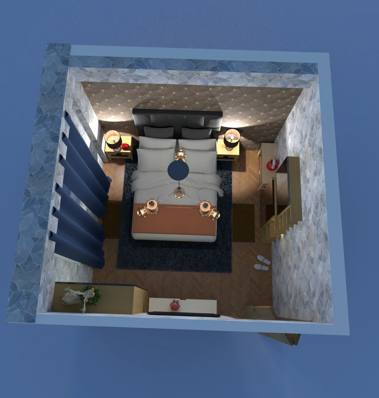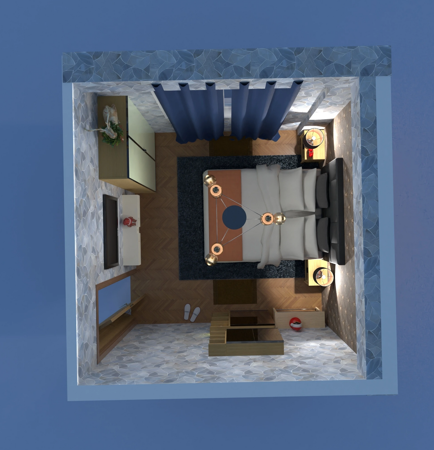 As requested, I used a French-size bed, with a TV positioned in front of it. The TV unit is wall-mounted to avoid occupying floor space and to maintain a clean and practical layout.