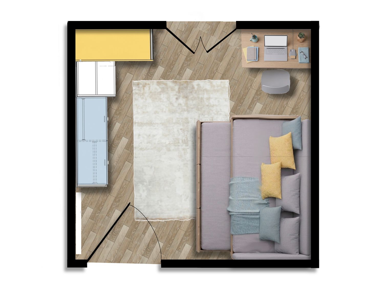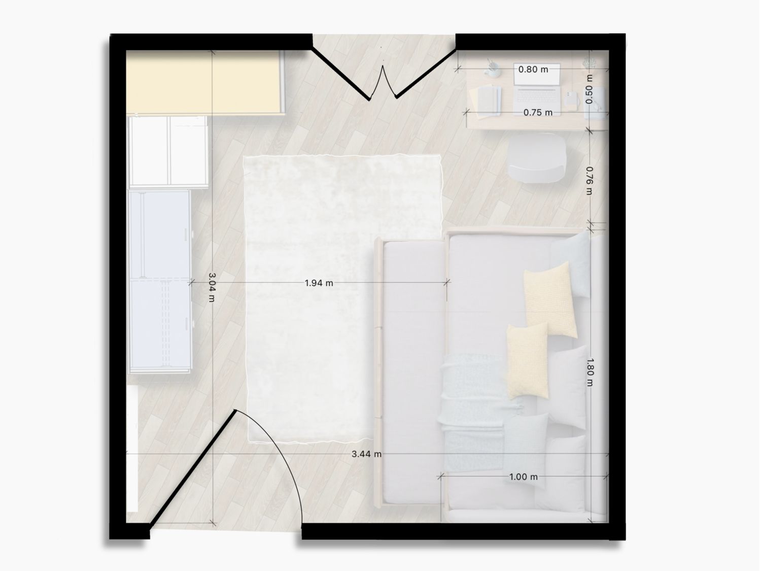 Considering the limited space, I focused on maximizing functionality by using a pull-out bed system, allowing the room to adapt between a single and a double sleeping arrangement when needed.