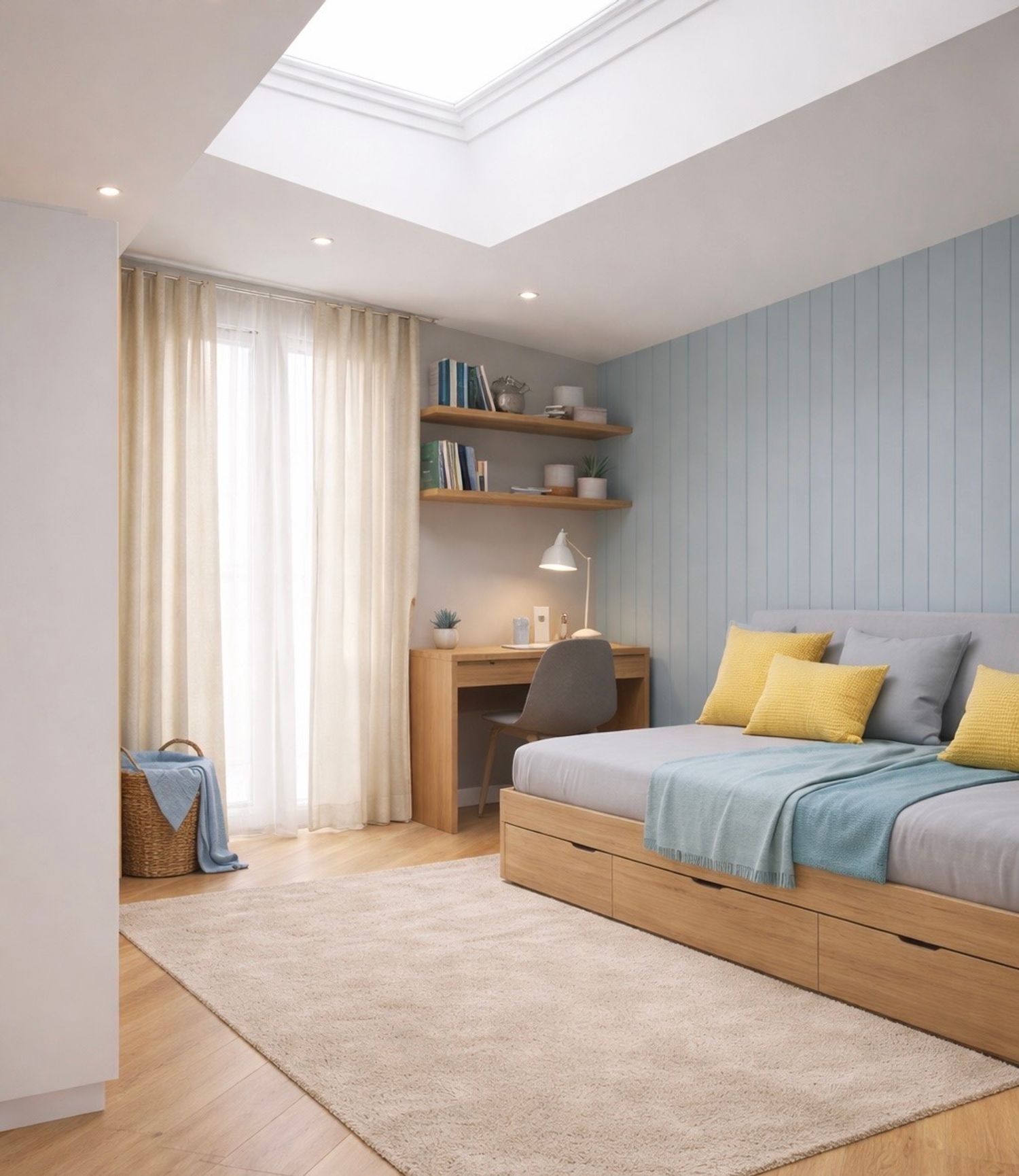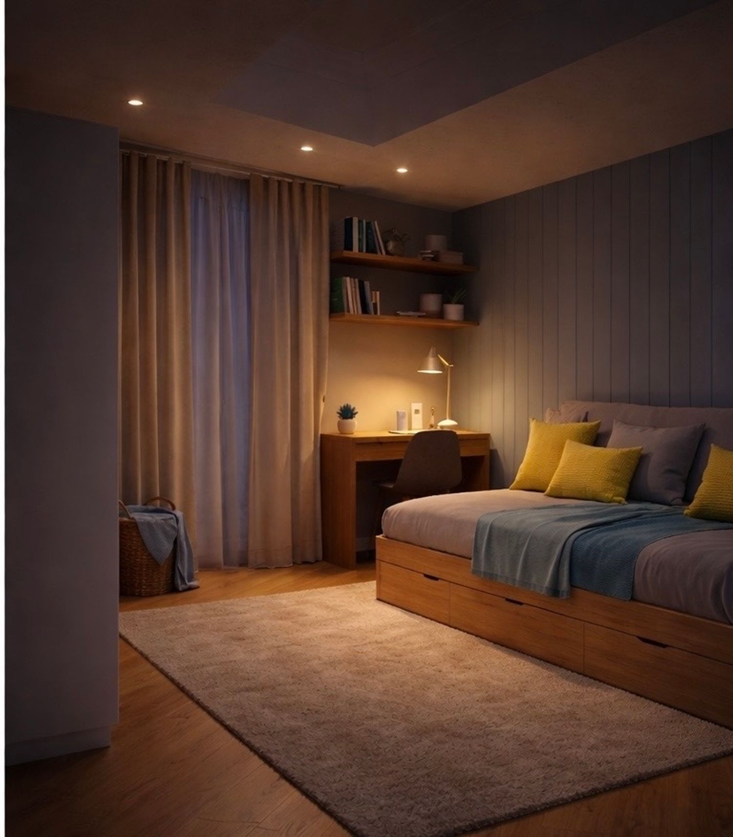 I also included a compact study desk suitable for reading and gaming, while carefully maintaining the existing corner wardrobe as requested.
