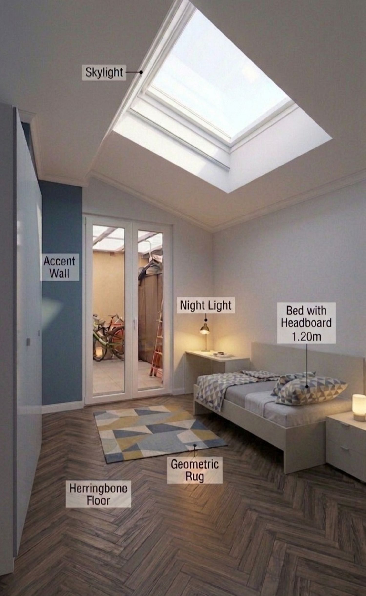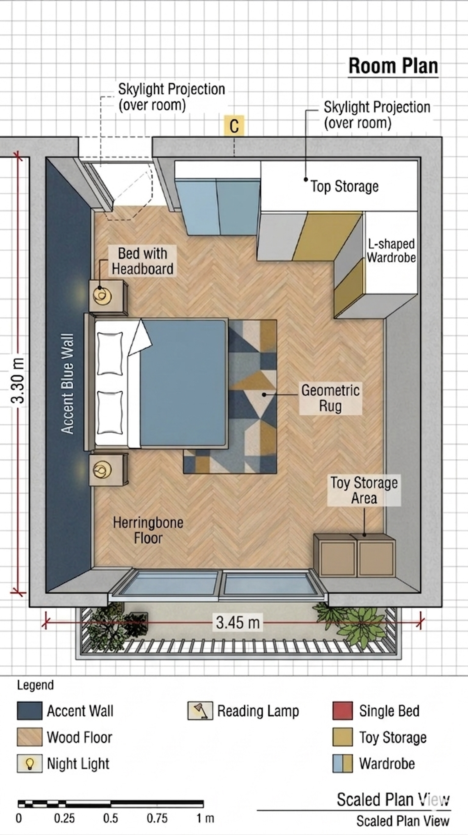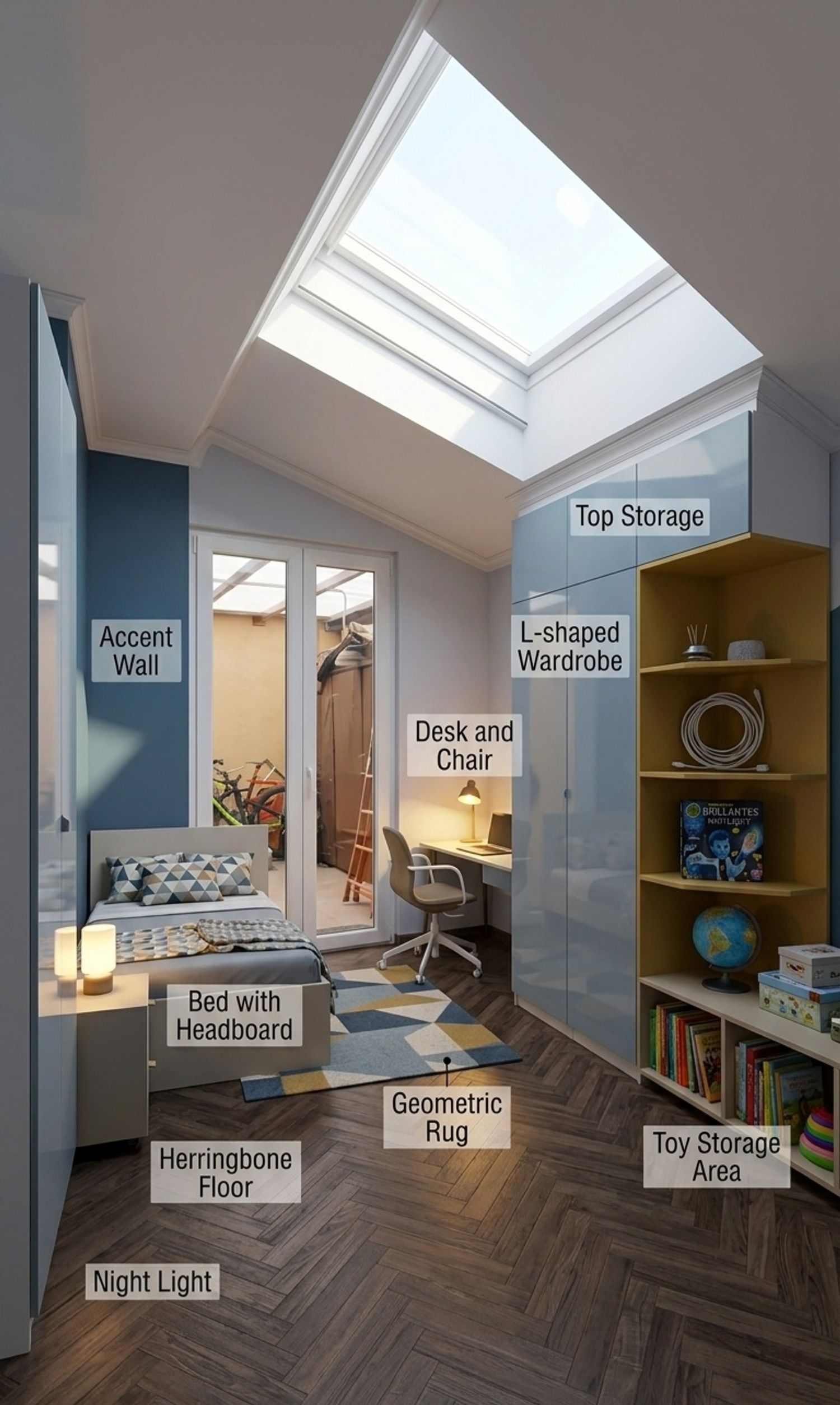 Bed: Place a planner and a small side table in the designated spot. Wardrobe: A wall-mounted seat.