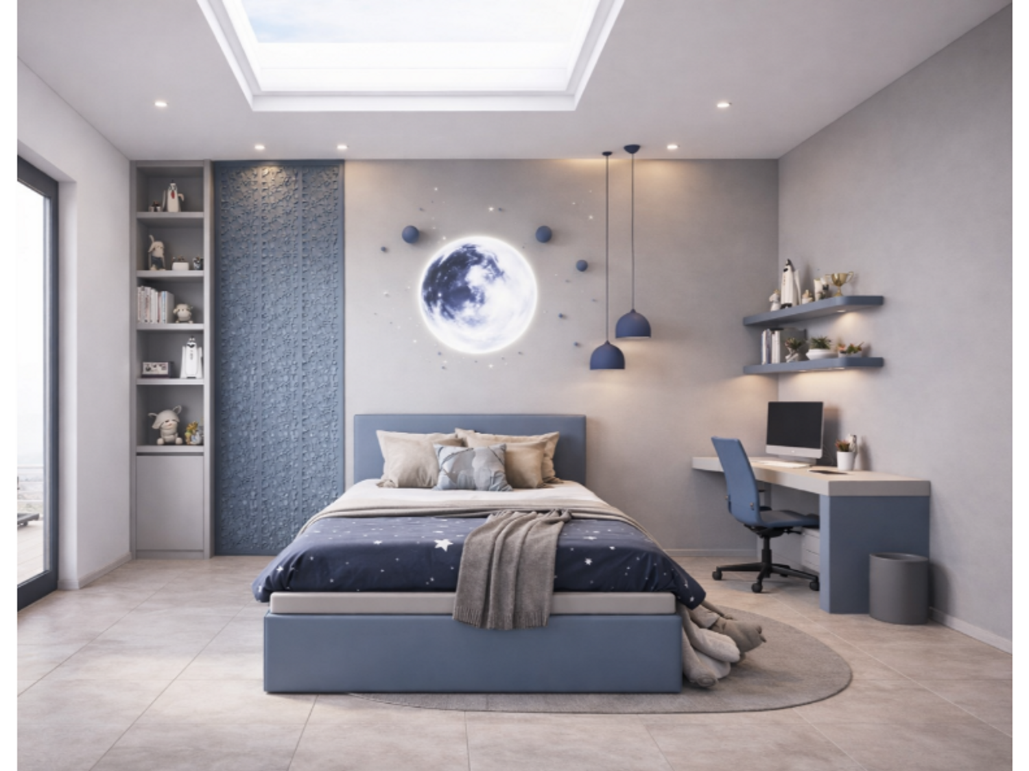 The design of this bedroom is based on creating a calm, functional, and visually engaging environment tailored for a 10-year-old child. The main concept revolves around the use of blue tones as the dominant color, which symbolizes tranquility, focus, and imagination.