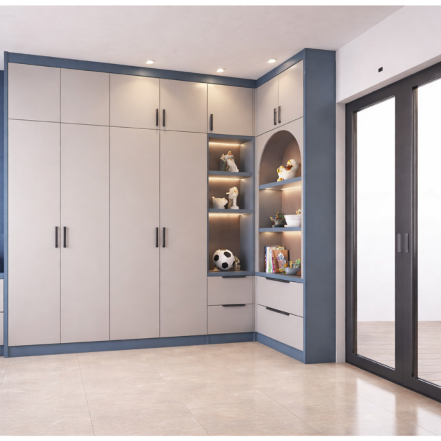The L-shaped wardrobe is designed to maximize storage efficiency while maintaining a clean and integrated look. Its layout follows the geometry of the room, allowing optimal use of corner space without overcrowding. The combination of closed cabinets and open shelves creates a balance between organization and personalization, enabling the child to display toys, books, and decorative elements.