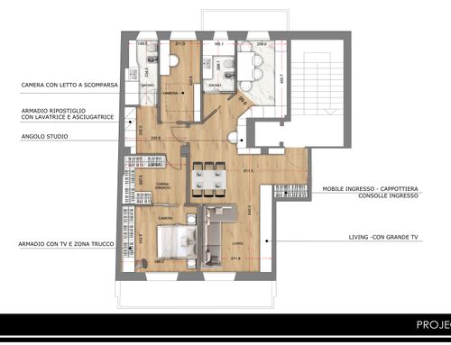 Nella camera matrimoniale vorremmo inserire la TV ed una postazione trucco. È gradita, se possibile, una cabina armadio.