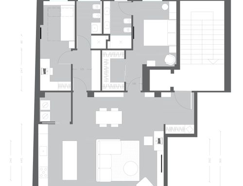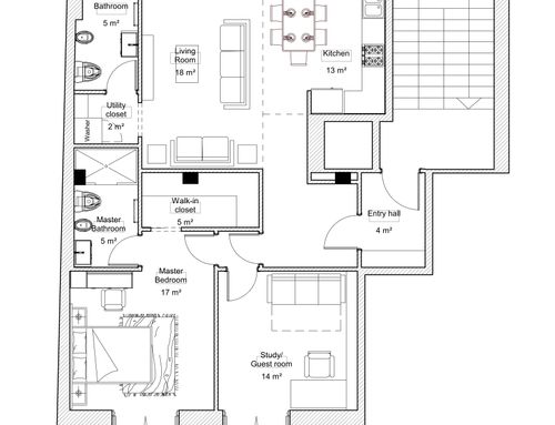 If possible, we would like the washing machine and dryer to be placed in a space created outside the bathrooms and the kitchen.