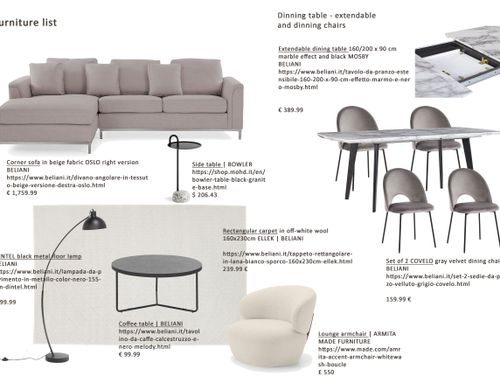In the choice of furniture, in addition to the aesthetic aspect, the focus should be on practicality and ease of use (for example, there should be no stools or high chairs). As for the colors, we love neutral / light shades but would like to add pops of color.