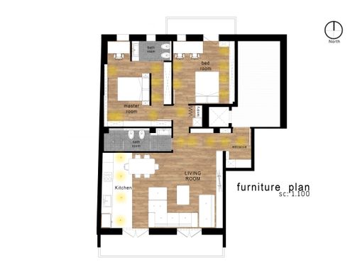The living room and the master bedroom are south-facing, while the kitchen, the second bedroom and the two bathrooms are north-facing.