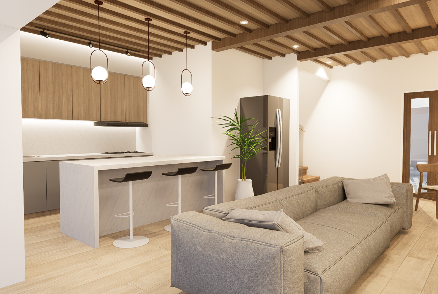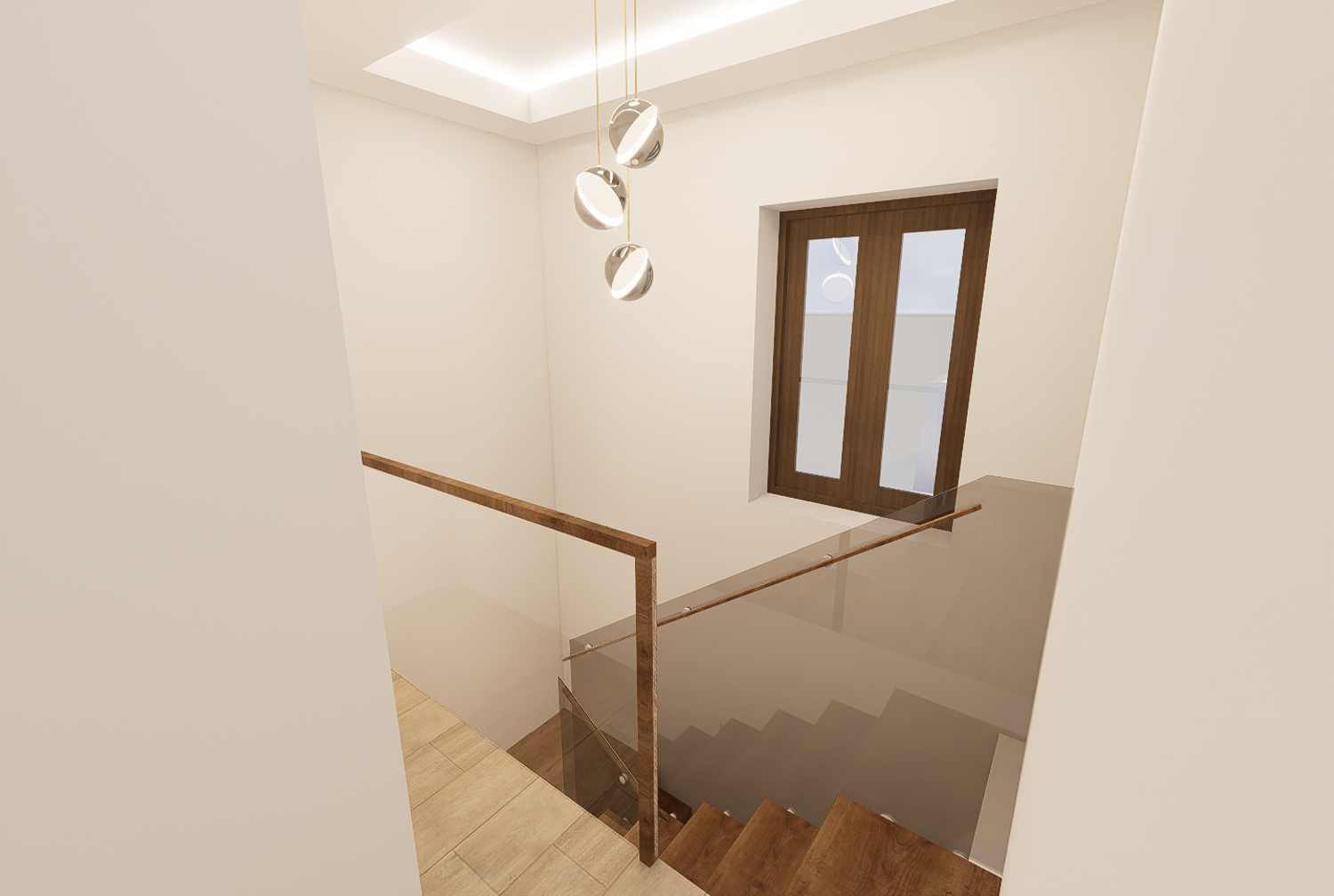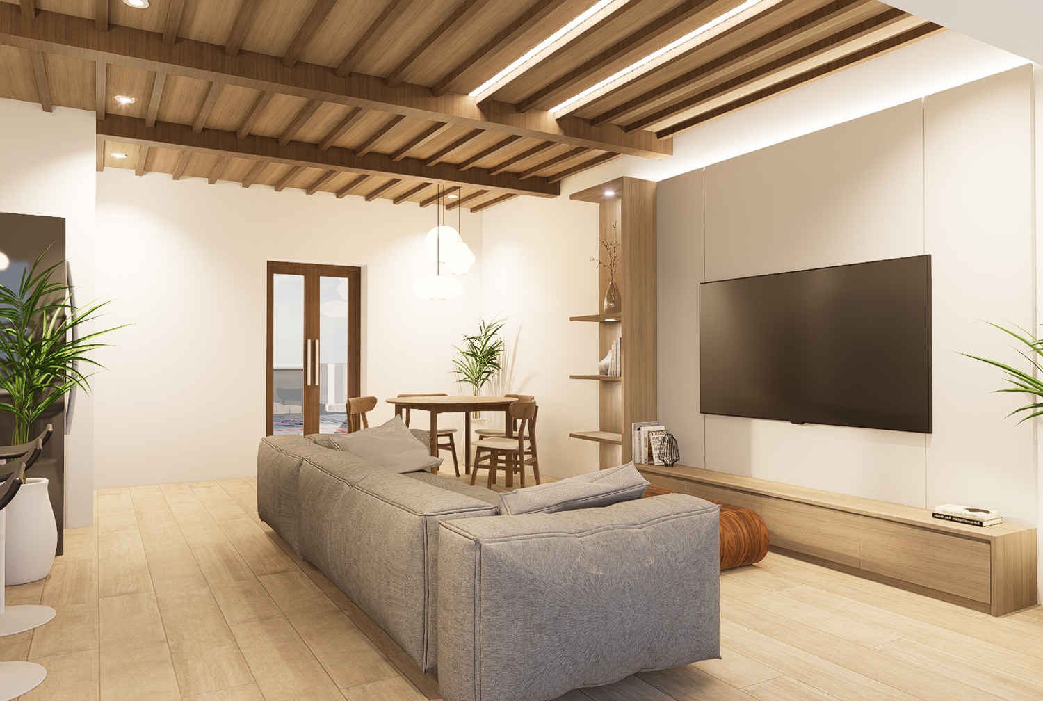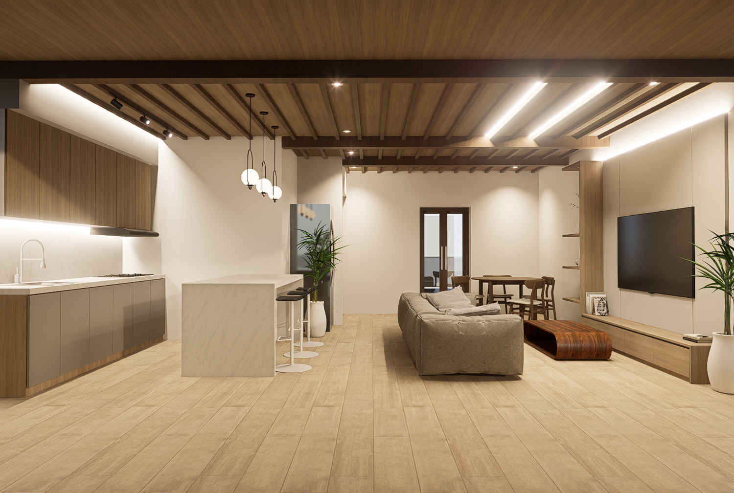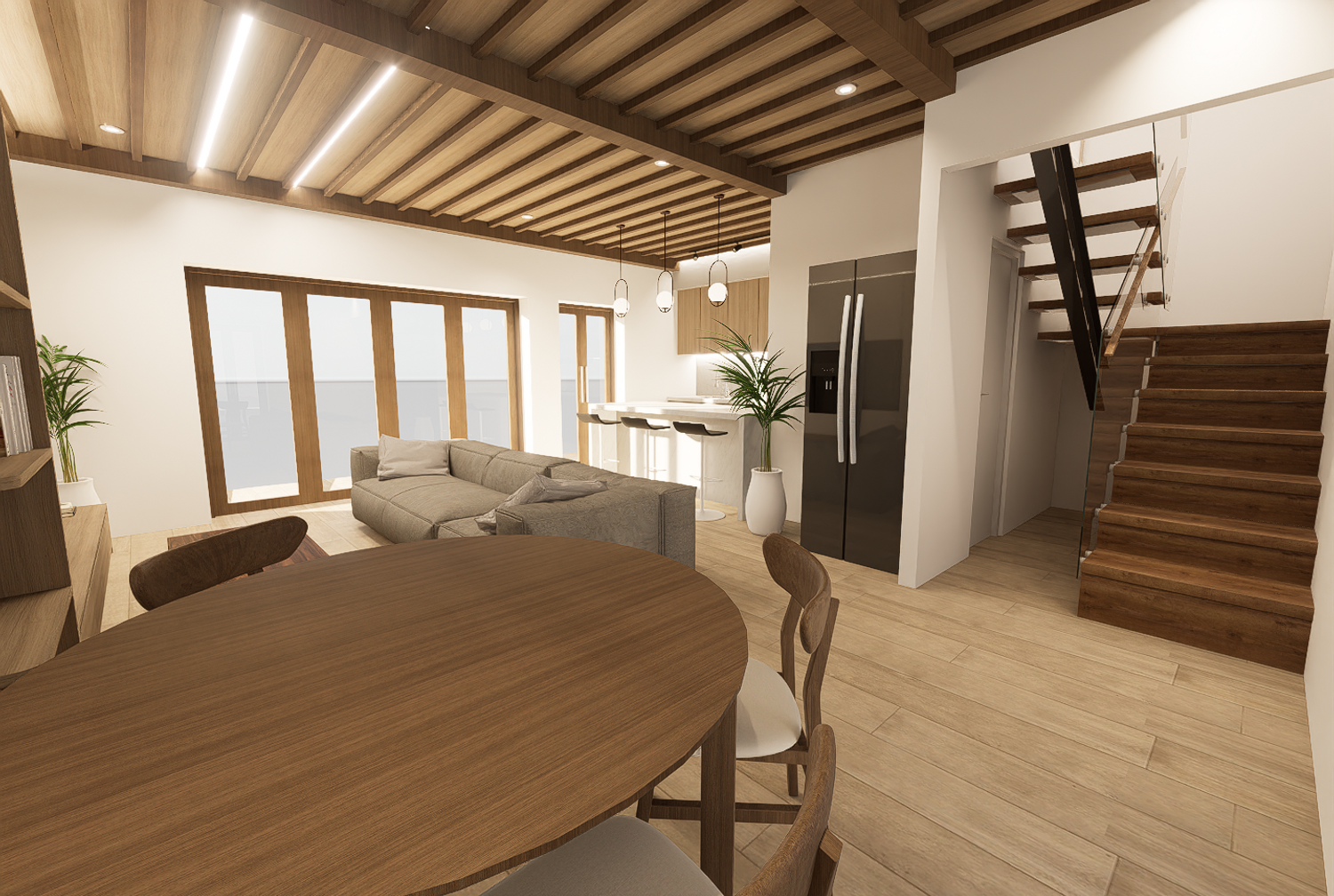 Nel complesso, propongo un concept dal carattere caldo, mantenendo il soffitto in legno orizzontale e integrandolo con uno sfondo dai toni coerenti con il materiale ligneo. Ho aggiunto anche diversi punti luce per rendere gli ambienti più luminosi e meno cupi.