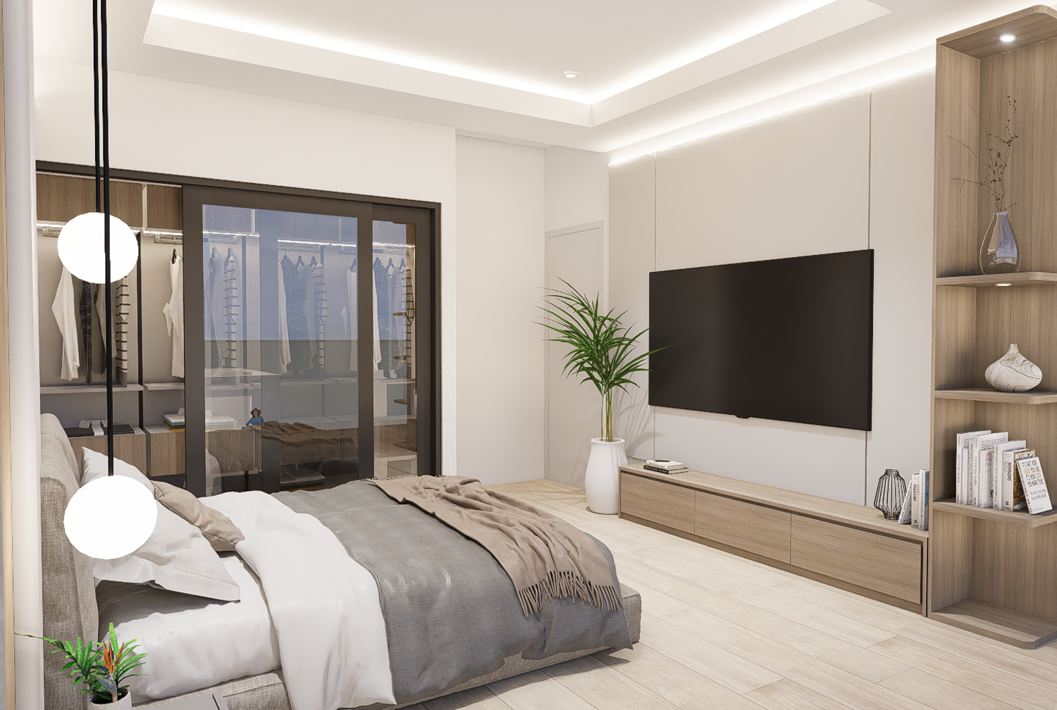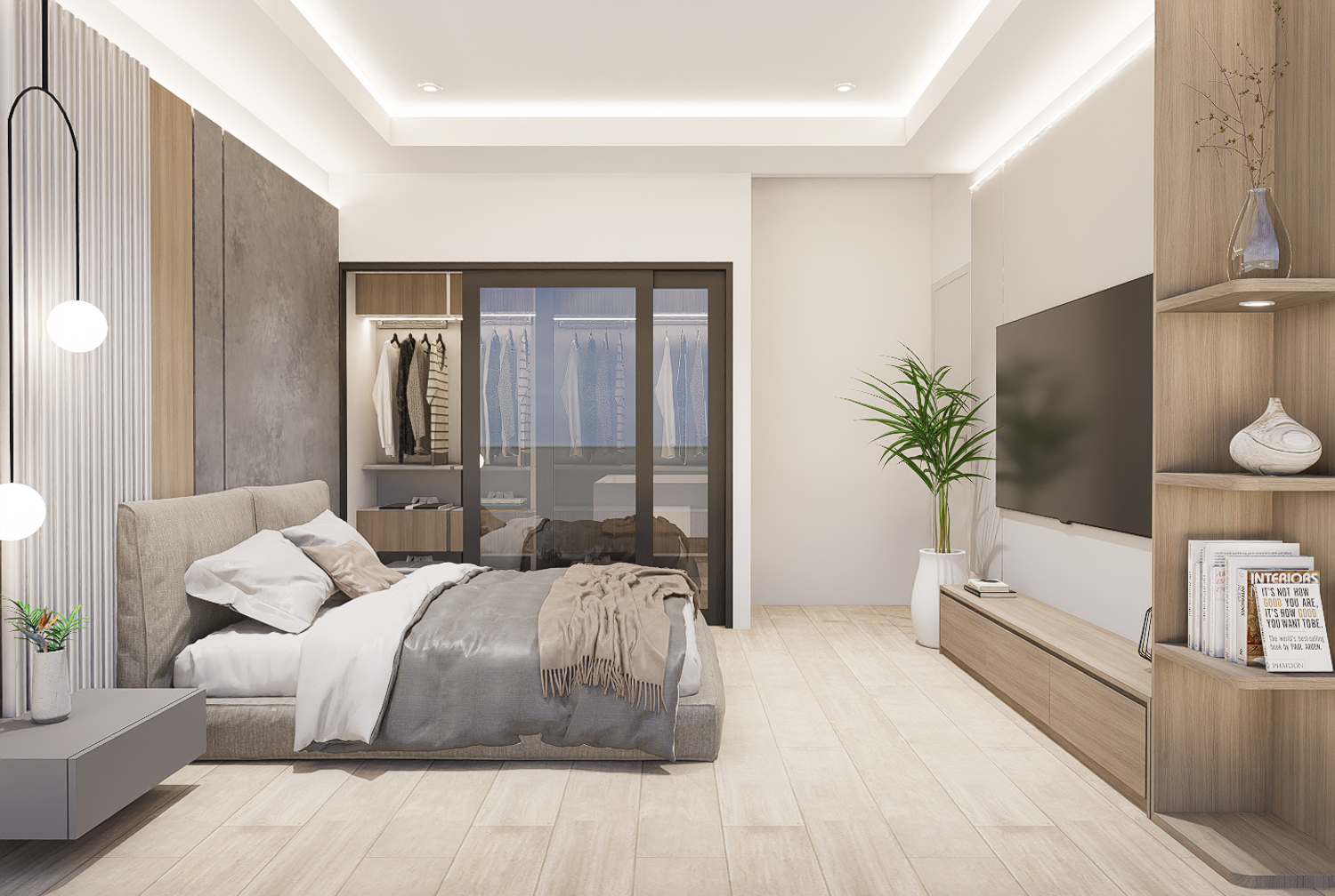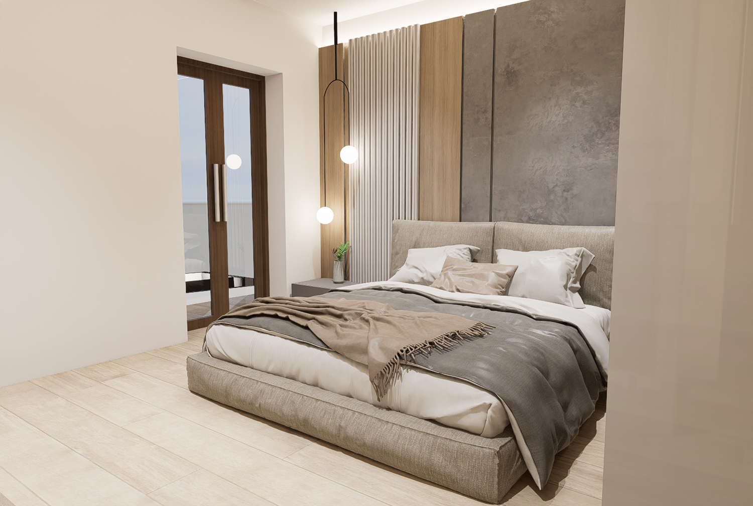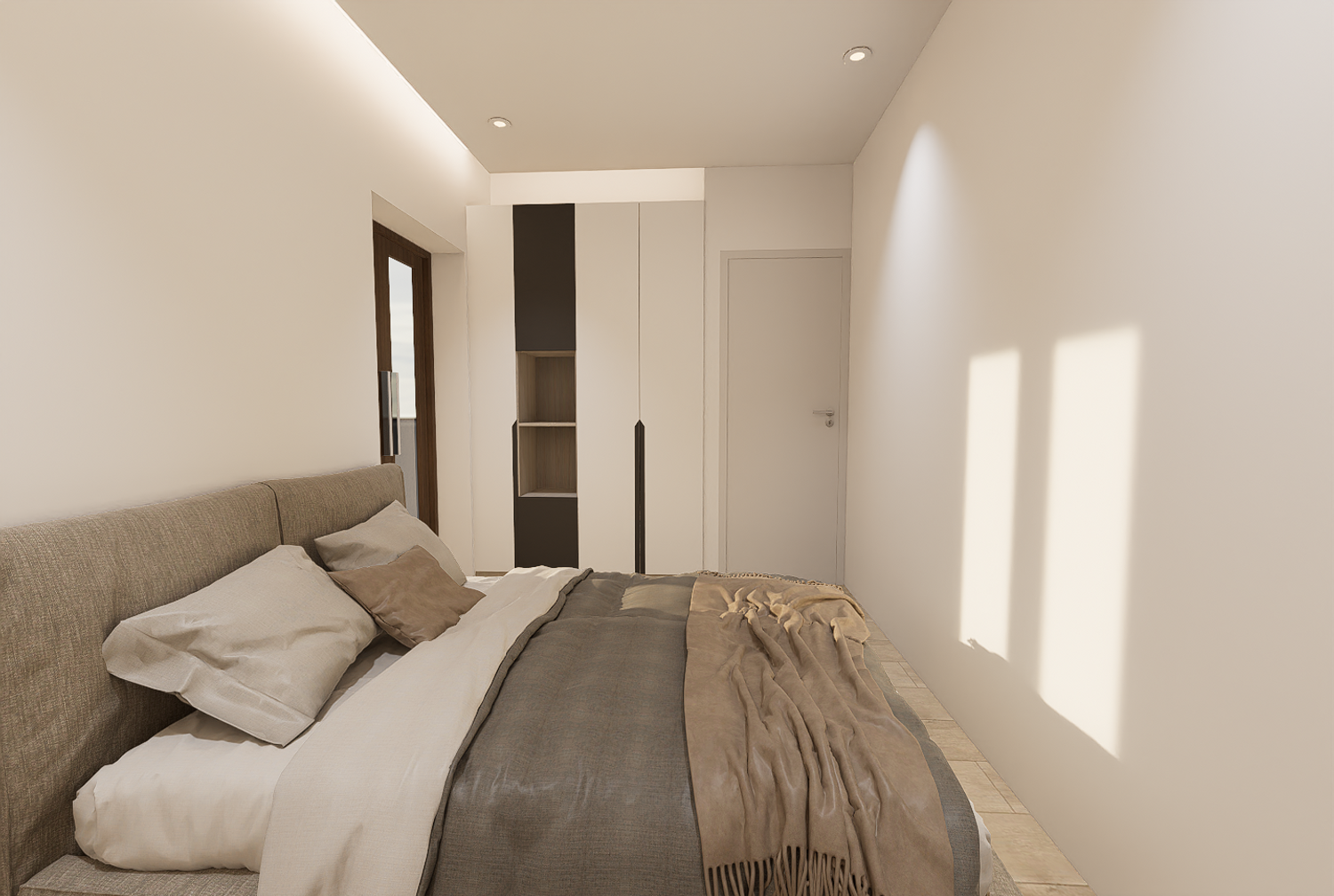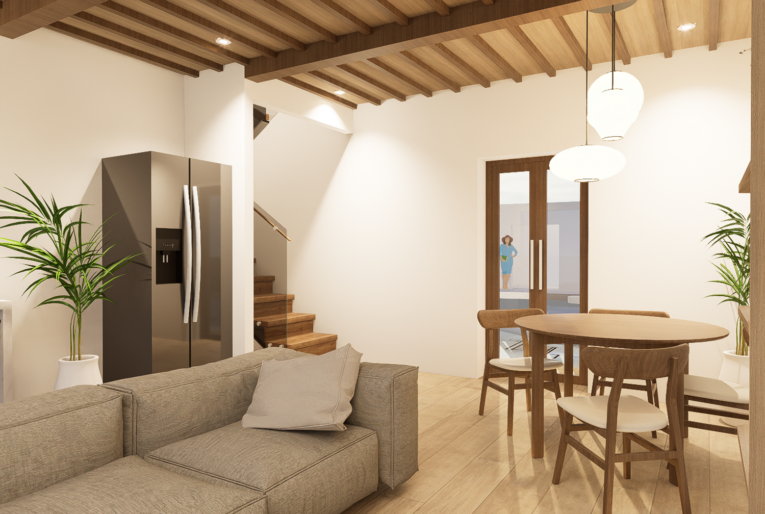 Nel complesso, propongo un concept dal carattere caldo, mantenendo il soffitto in legno orizzontale e integrandolo con uno sfondo dai toni coerenti con il materiale ligneo. Ho aggiunto anche diversi punti luce per rendere gli ambienti più luminosi e meno cupi.
