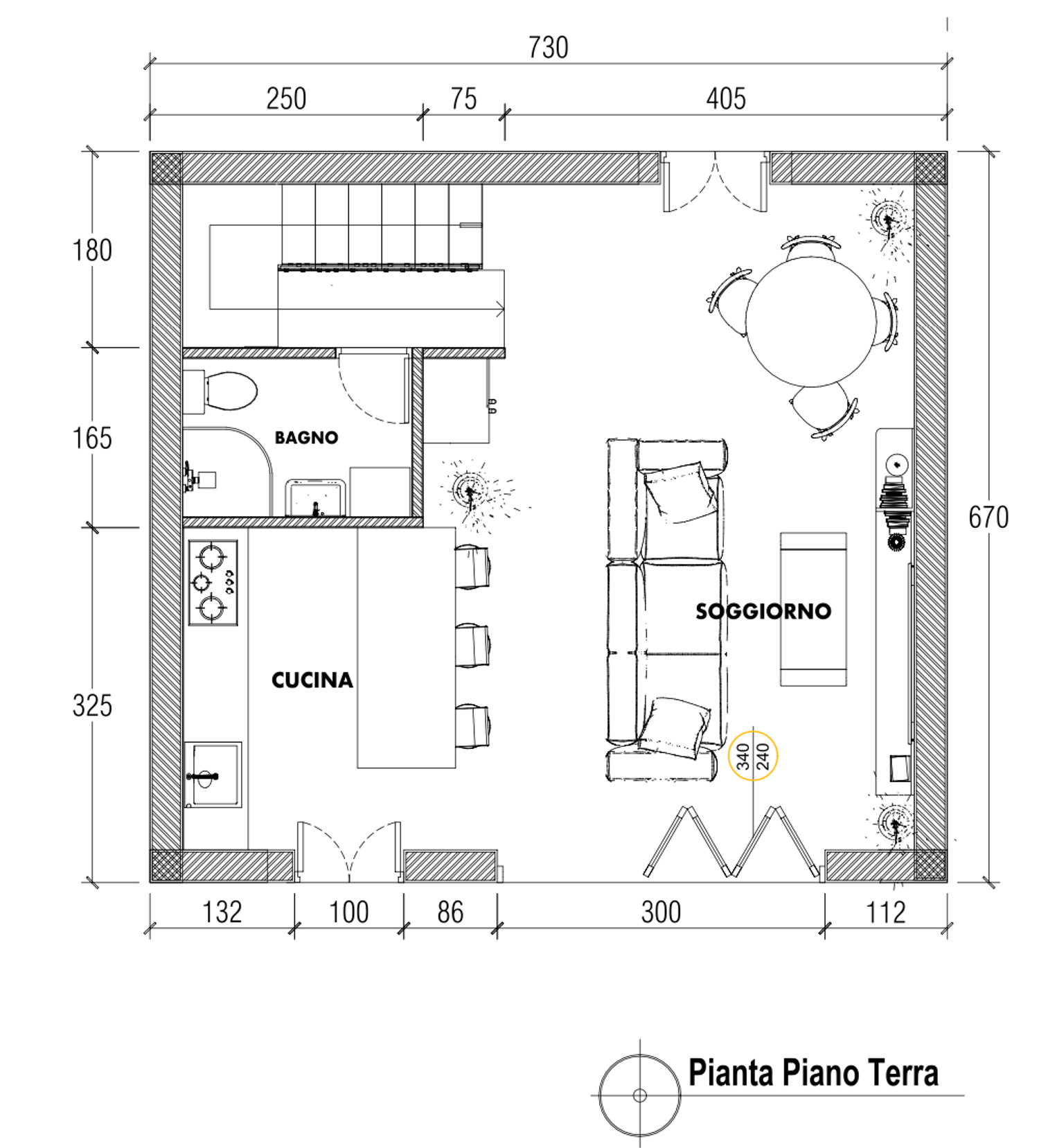 Per quanto riguarda la scala, consiglio di trasformarla in una scala a U per ridurre la pendenza ed evitare che la testa possa urtare le travi strutturali.