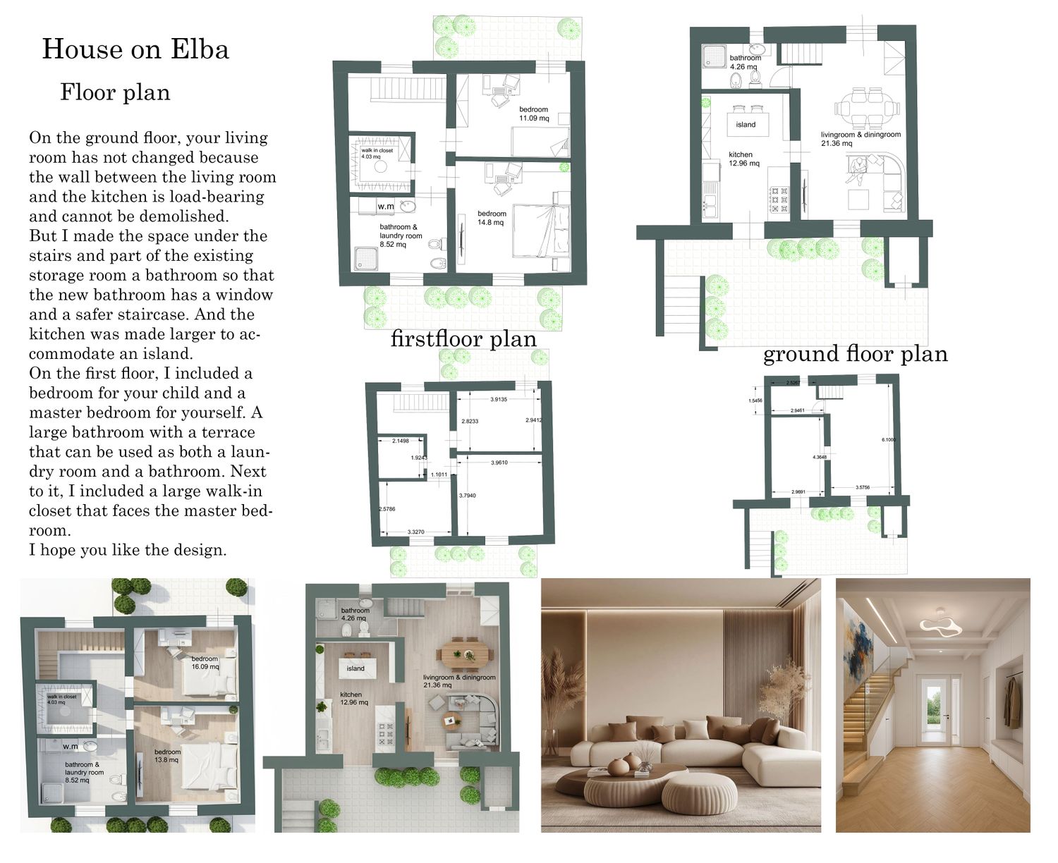 On the first floor, I included a bedroom for your child and a master bedroom for yourself. A large bathroom with a terrace that can be used as both a laundry room and a bathroom. Next to it, I included a large walk-in closet that faces the master bedroom.
