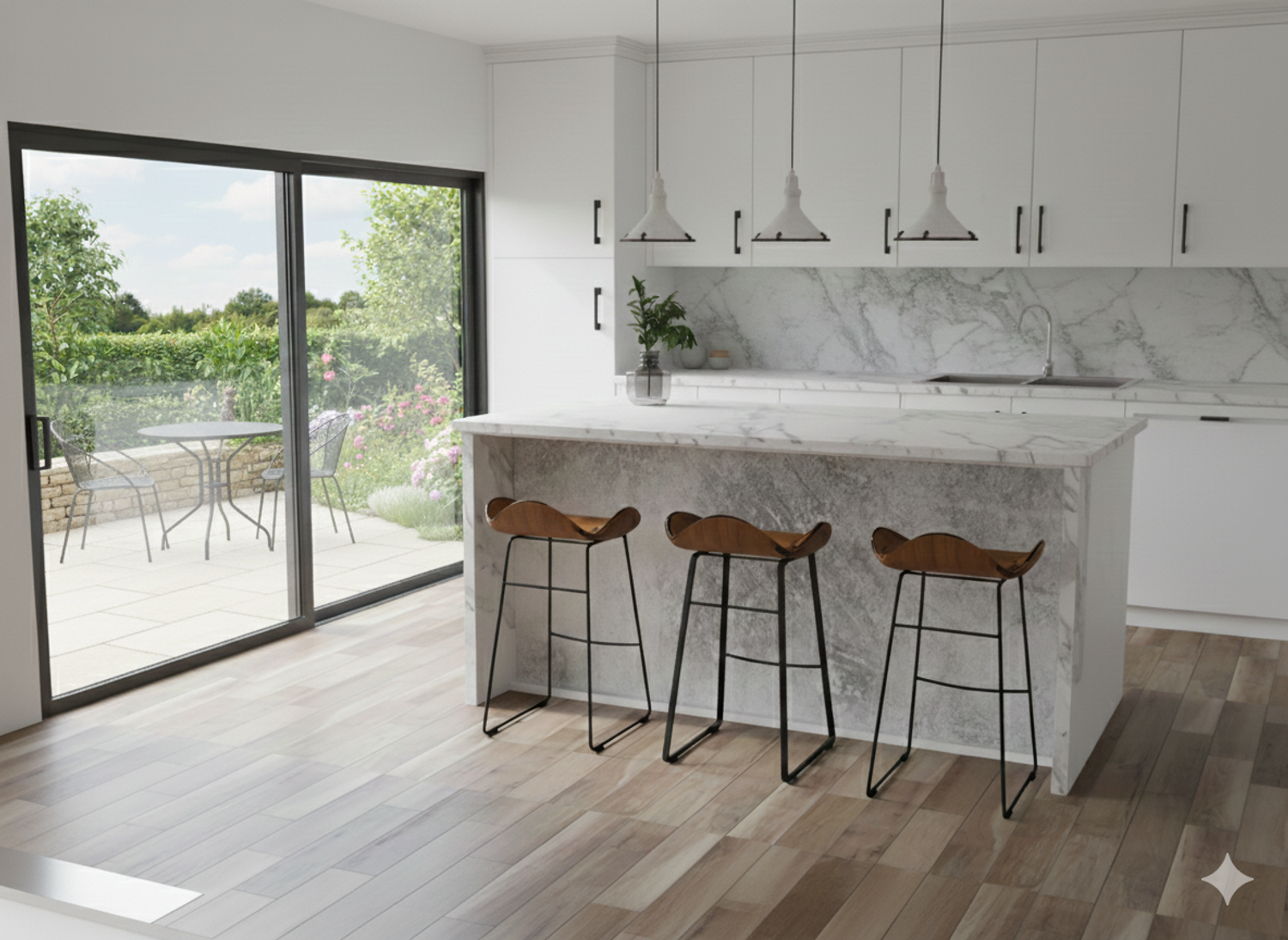 The kitchen was redesigned in an L-shaped layout with a central island, while carefully applying the work triangle principle to ensure efficient functionality and smooth circulation.