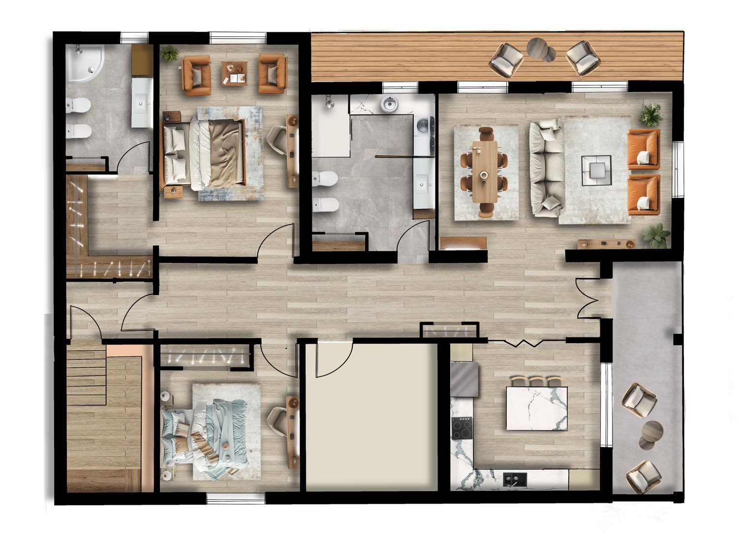 All your requirements were carefully considered during the design process, and a fully furnished floor plan has been developed for the new layout in full alignment with your requests.